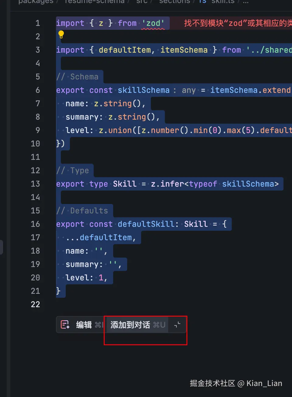 发现App.vue文件有一个报错,显然是这个没有从langchain中导入,考验一下ai,接着使用鼠标选中,在显示的操作上点击“添加到对话”询问它,它也给出了正确答案