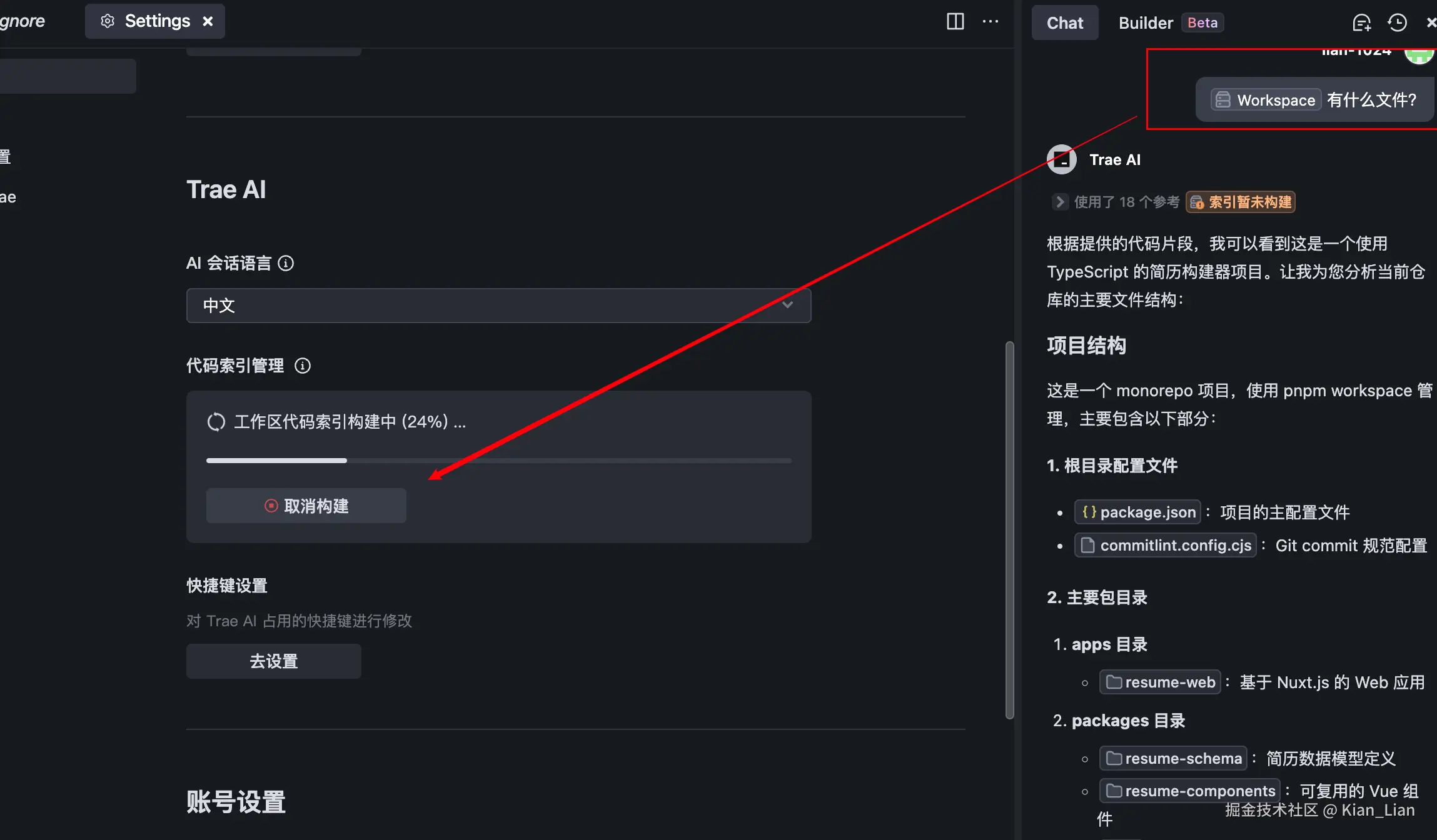 如果你想提高ai回答的准确性时,可以在设置中构建索引,构建度越高,ai回答的准确性也就越高,当构建度为100%的时候,回答的准确率是最高的,符合当前项目