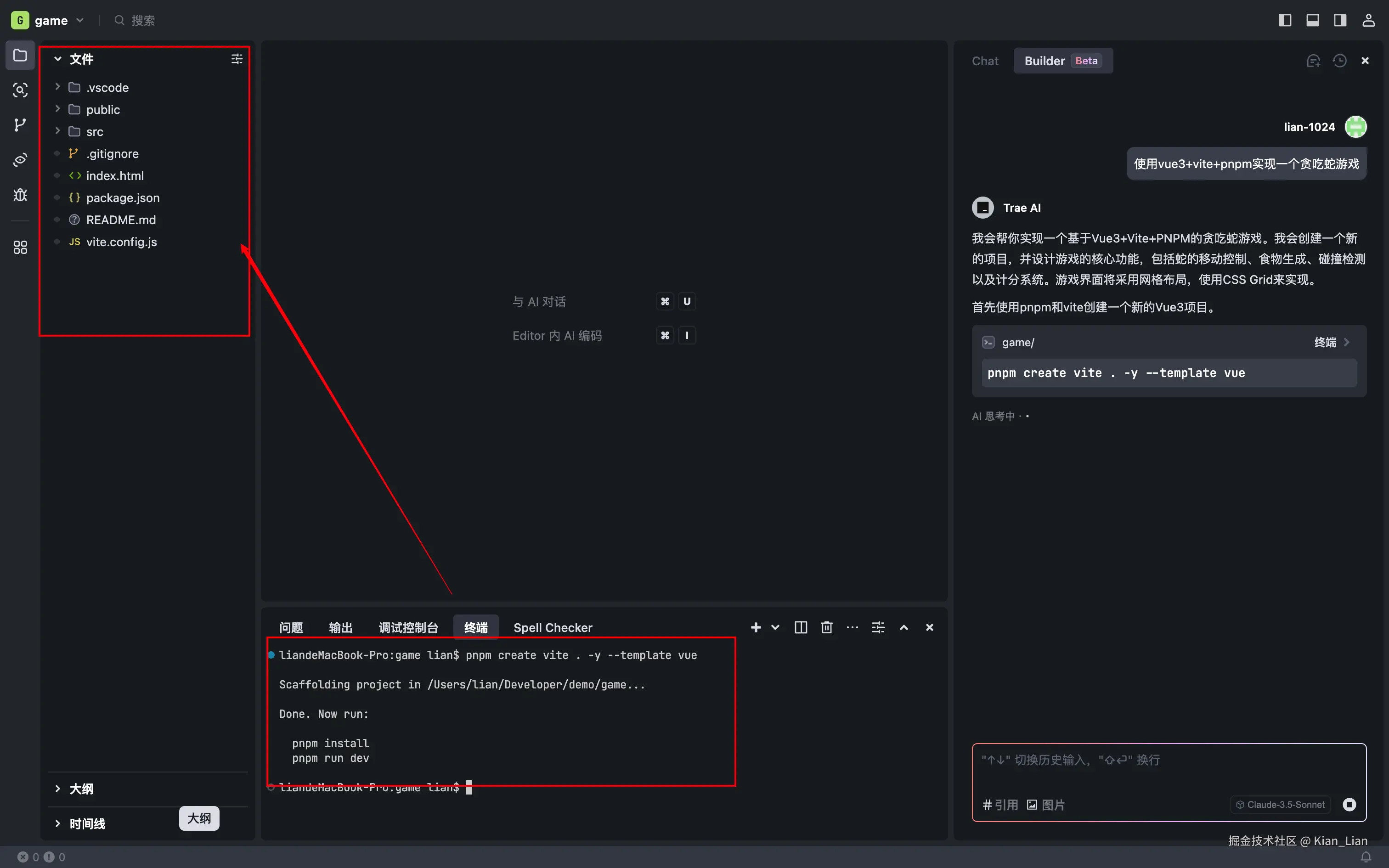 这样就使用 Builder 模式开发了一个贪吃蛇游戏,在这个过程中,你只需要点击确认运行的按钮,其他事情(编写代码、创建文件、修复 bug)都由 AI 自动完成,无需动手写代码等