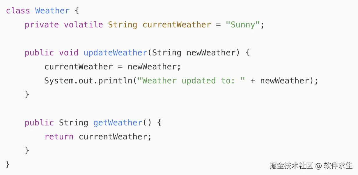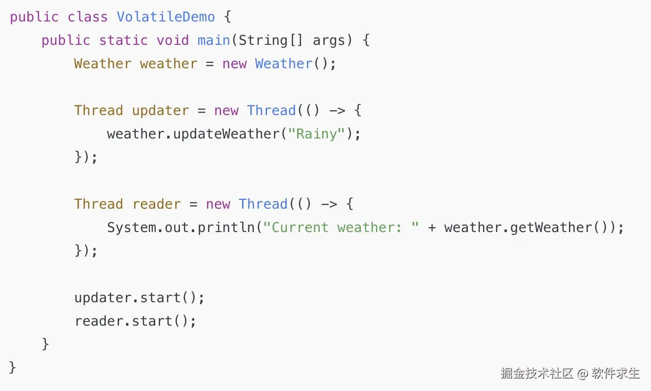 注意: volatile只保证可见性,不保证操作的原子性,比如currentWeather++这种操作,仍需要synchronized或AtomicInteger来保护。