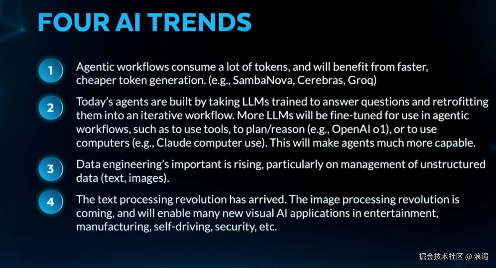 - 解释:代理工作流(agentic workflows)消耗大量的令牌(tokens),这些令牌用于表示数据或指令。更快、更便宜的令牌生成技术将使这些工作流受益。例如,SambaNova、Cerebras和Groq等公司正在开发高性能的硬件,以加速令牌生成过程。