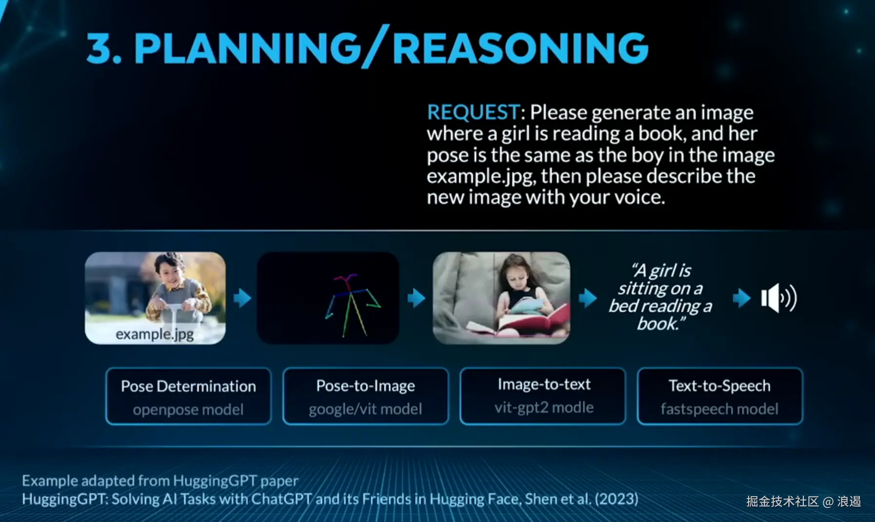- 实际应用案例 :假设你希望从一张图片中提取动作特征,并将其转化为文字描述,最后转换为语音输出。AI代理会按照以下步骤操作:首先使用OpenPose模型提取动作,然后采用Google Weight模型将动作转换成图片,接着使用WAA GPT Two模型将图片转成文字,最后利用Fast Speech模型将文字转成语音。
