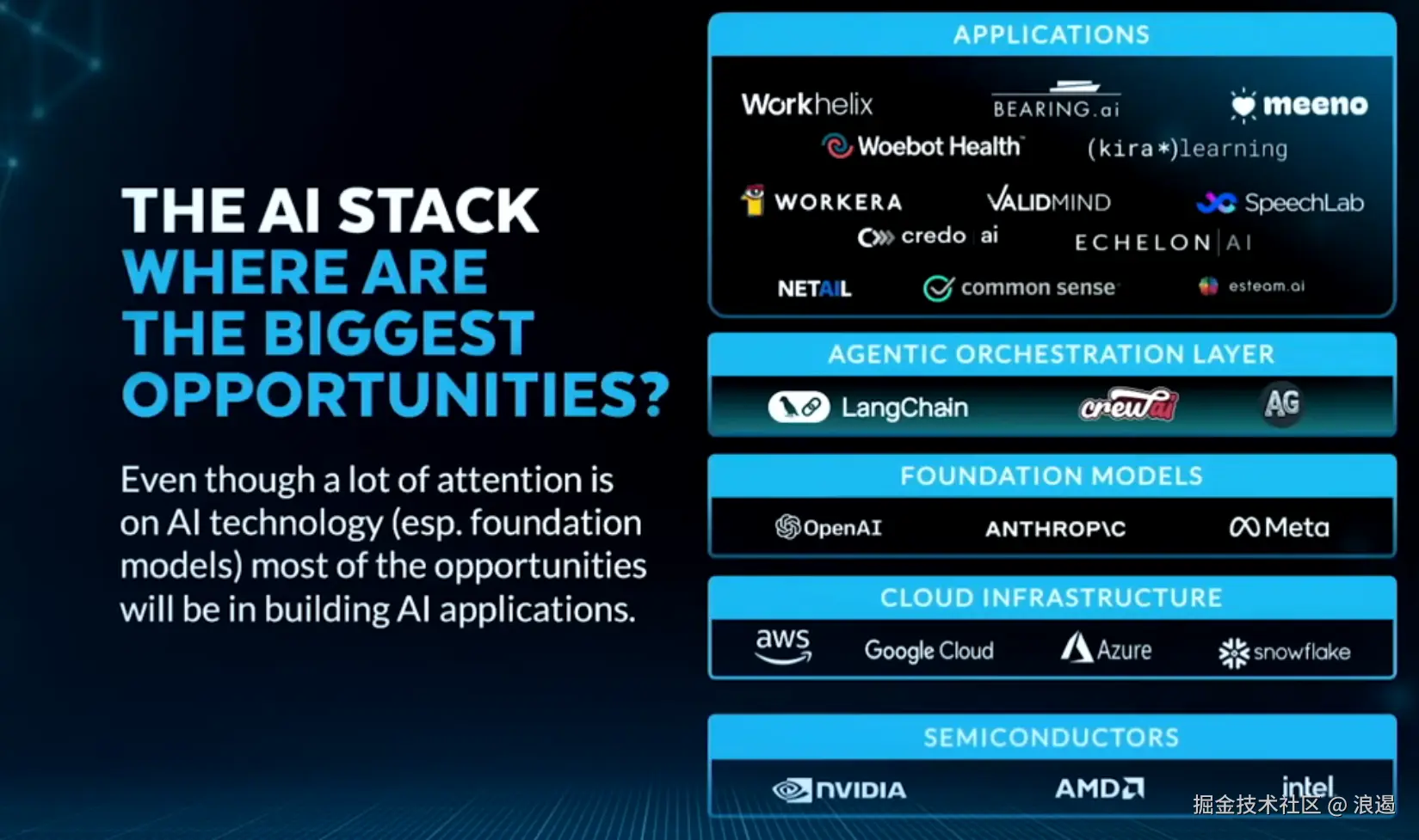 - 半导体层指的是支撑AI技术硬件层面的基础,尤其是高性能计算芯片。这些芯片对于执行复杂的AI算法至关重要。像NVIDIA、AMD和Intel这样的公司生产专门用于加速机器学习任务的GPU和其他类型的处理器。