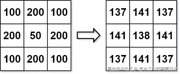 每个单元格的 平均灰度 定义为:该单元格自身及其周围的 个单元格的平均值,结果需向下取整(即需要计算蓝色平滑器中 个单元格的平均值)。