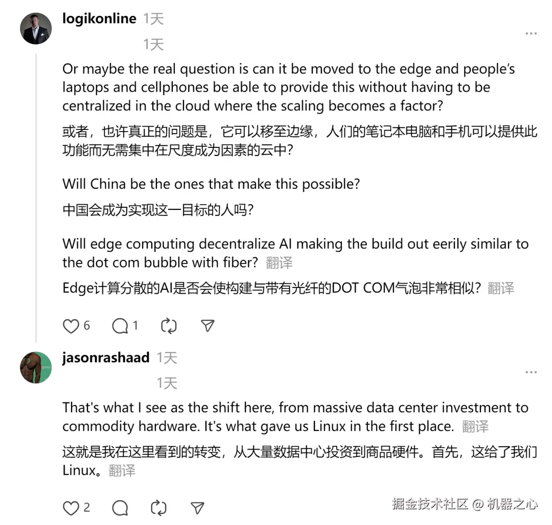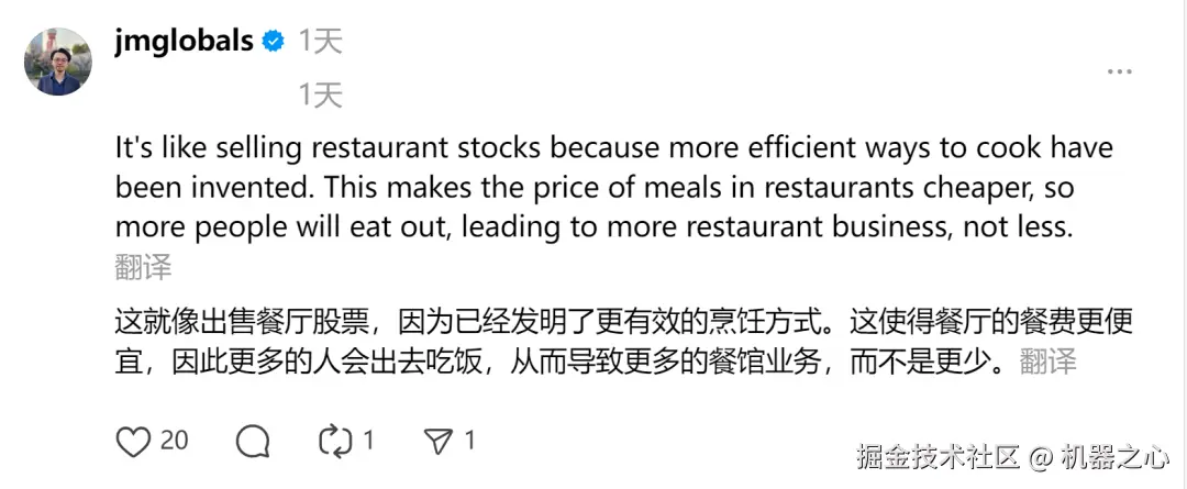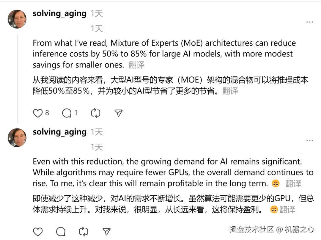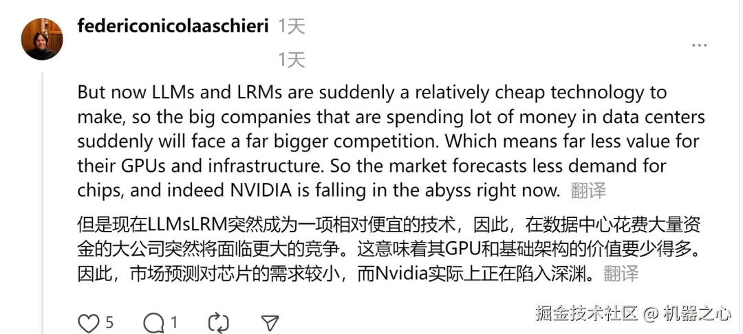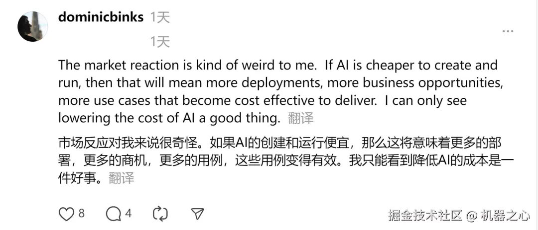 不少网友对 LeCun 的看法表示赞同,认为训练、推理成本更低的 AI 意味着这项技术能更快普及,从而创造更大的市场。