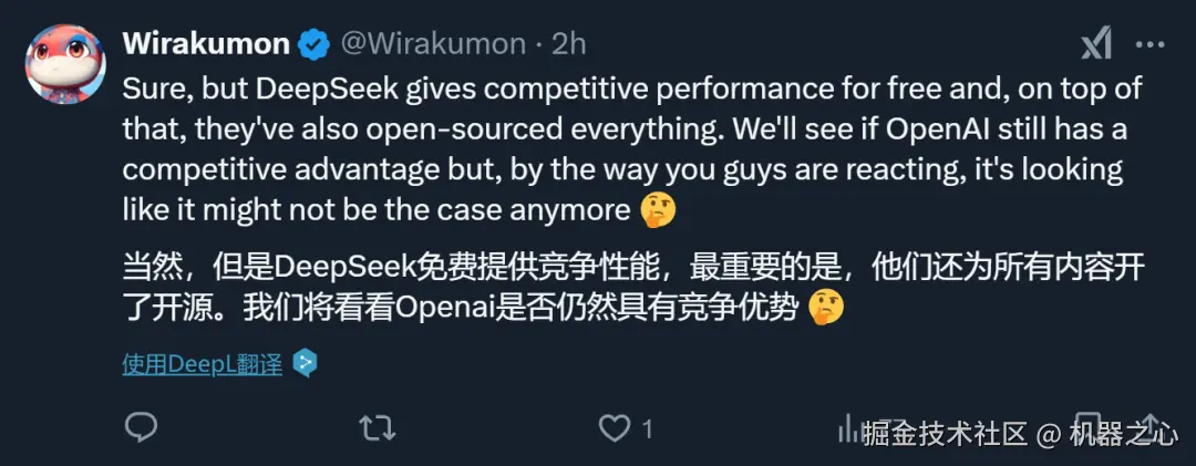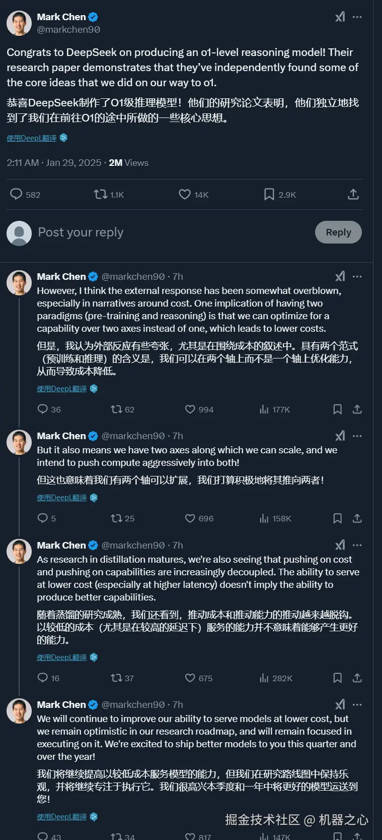 随后,OpenAI 首席研究官 Mark Chen 也发了帖。他表示,DeepSeek 确实独立发现了一些 OpenAI o1 也在用的核心理念,不过,这并不代表 OpenAI 在算力上的高投入是不合理的。