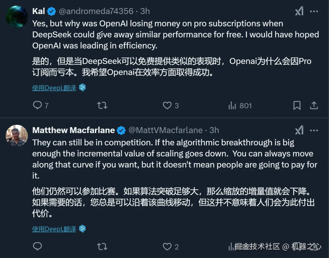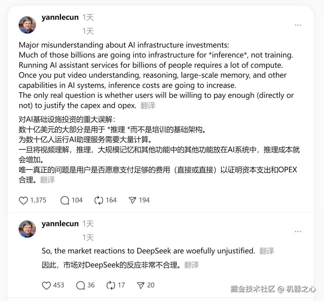 图灵奖得主、Meta AI 首席科学家 Yann LeCun 也认为市场对于 DeepSeek 的成本反应并不合理。不过,他是从推理的角度来看的。他指出,人们常常以为巨额投资主要用于训练更强大的模型,但实际上大部分钱都花在了让这些 AI 服务能够稳定地服务数十亿用户身上。而且随着 AI 能力的增强,维持服务运行的成本会变得更高,关键是要看用户是否愿意为这些增强的功能付费。