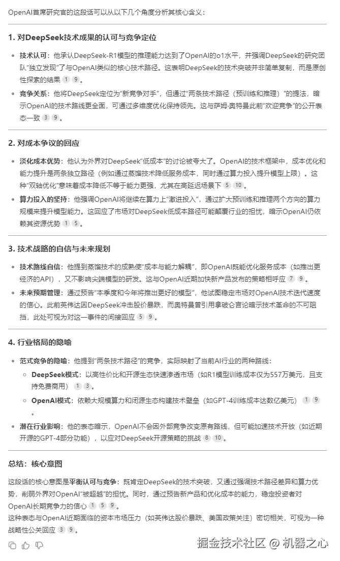 短短几段话,Mark Chen 表达了好几层观点,我们让 DeepSeek-R1 来解读一下每段话的言外之意: