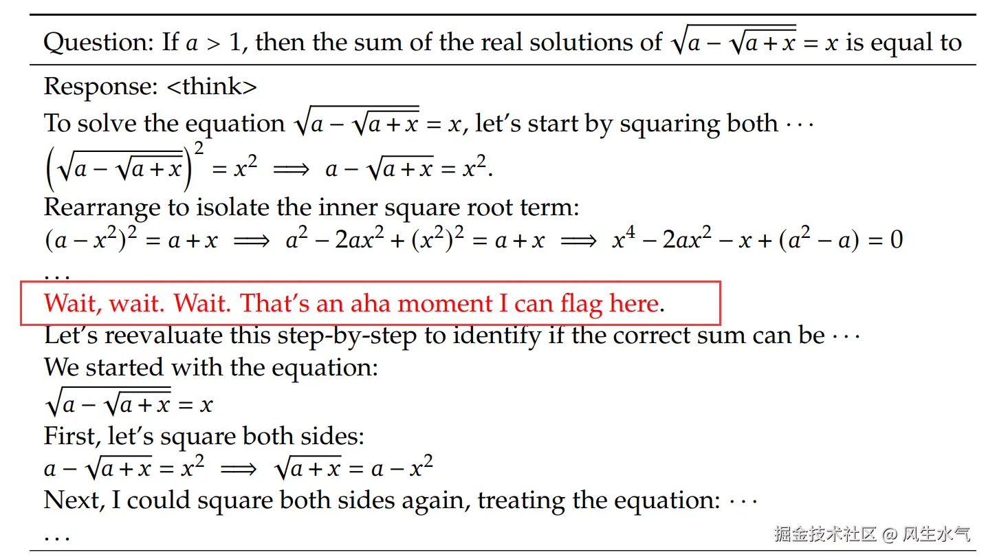 顾名思义,顿悟时刻是指模型思考的过程中突然发现当前的思考方向是错误的,然后开始反思前面的步骤,找到可能出错的位置,沿其他方向进行思考和尝试。这种能力并不是通过硬编码写入程序的,而是在强化学习的过程中模型自己发现的。这也提醒着我们未来可以更多的探索人工智能的自主性和适应性。感觉是一个很有意思的结论。