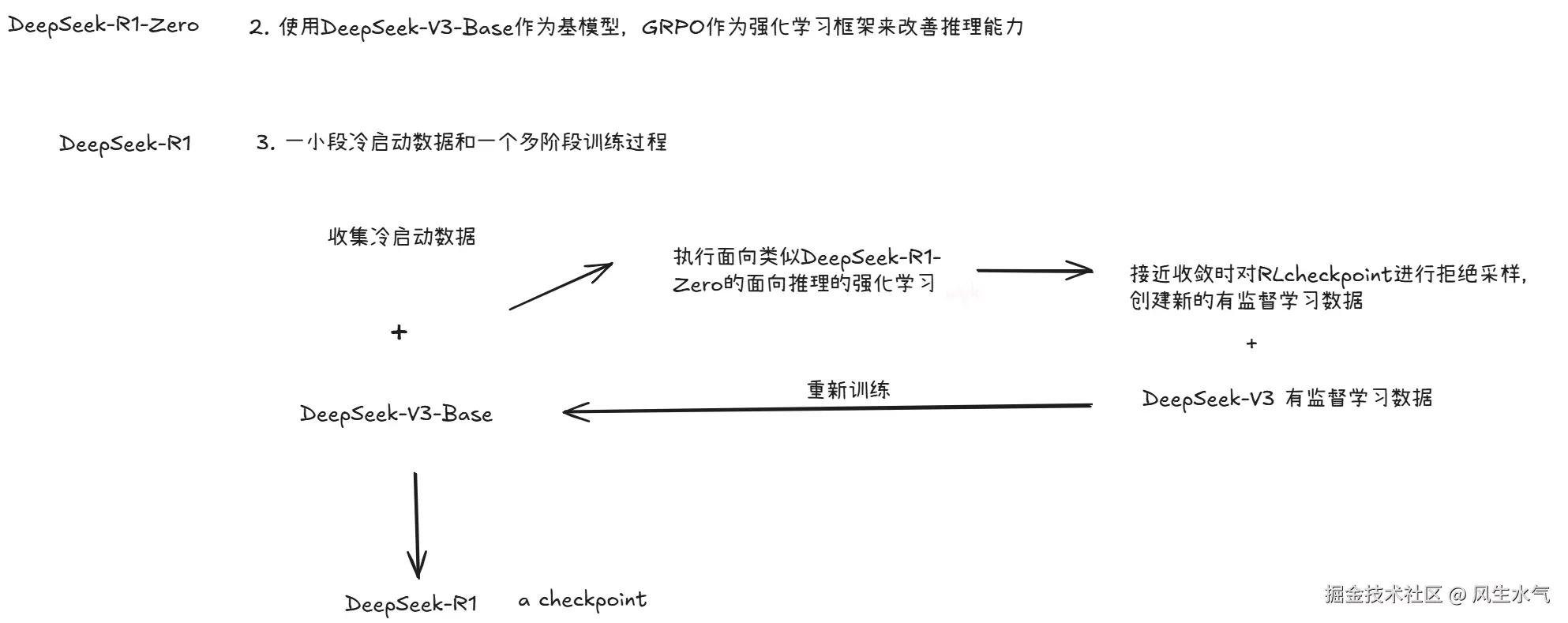 相比于传统大模型的训练,DeepSeek-R1最大的创新点是使用大规模强化学习过程替代传统的依赖大量高质量数据的有监督微调了。这是一种新的尝试,并且通过在DeepSeek R1 Zero上进行实验来验证其有效性。这个创新的过程中存在两个模型:基于大规模强化学习的DeepSeek-R1-Zero和进一步优化可读性差、语言混合处理等问题的DeepSeek-R1。两个模型的训练处理流程如下:
