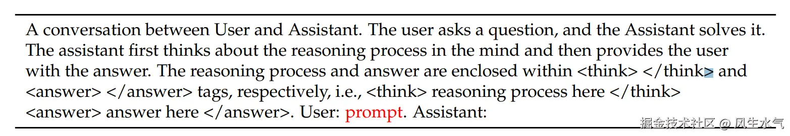 训练过程中会预先设置好提示词模板,在DeepSeek-R1-Zero的训练过程中使用的提示词模板如下。通过提示词可以看到,在训练的过程中我们不仅要求模型给出回答,还要求将思考的过程也存储下来。这些信息会被要求写入到相应的tag中去,这种固定格式的写入最终也是通过一个格式奖励模型来优化完成的。
