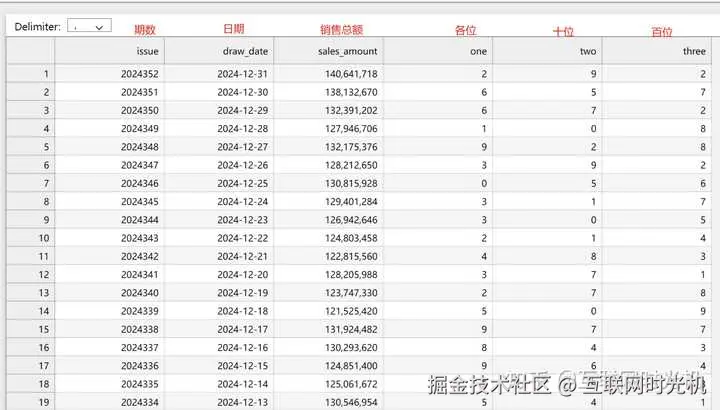以下是我采集的2024年全年的3D球的数据,包括每期的销售总额和三个数字。
