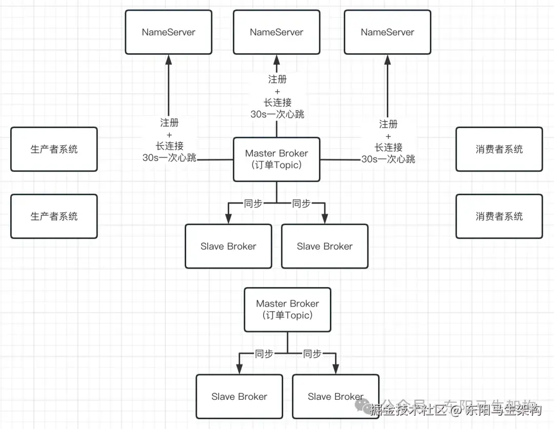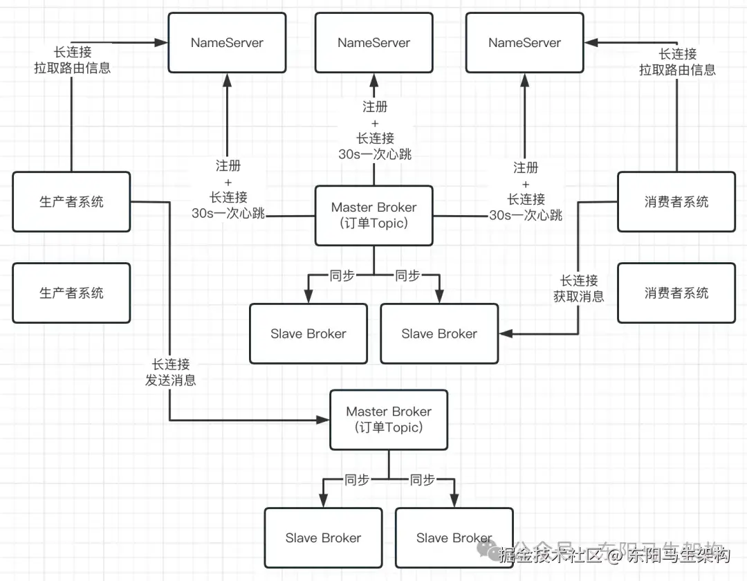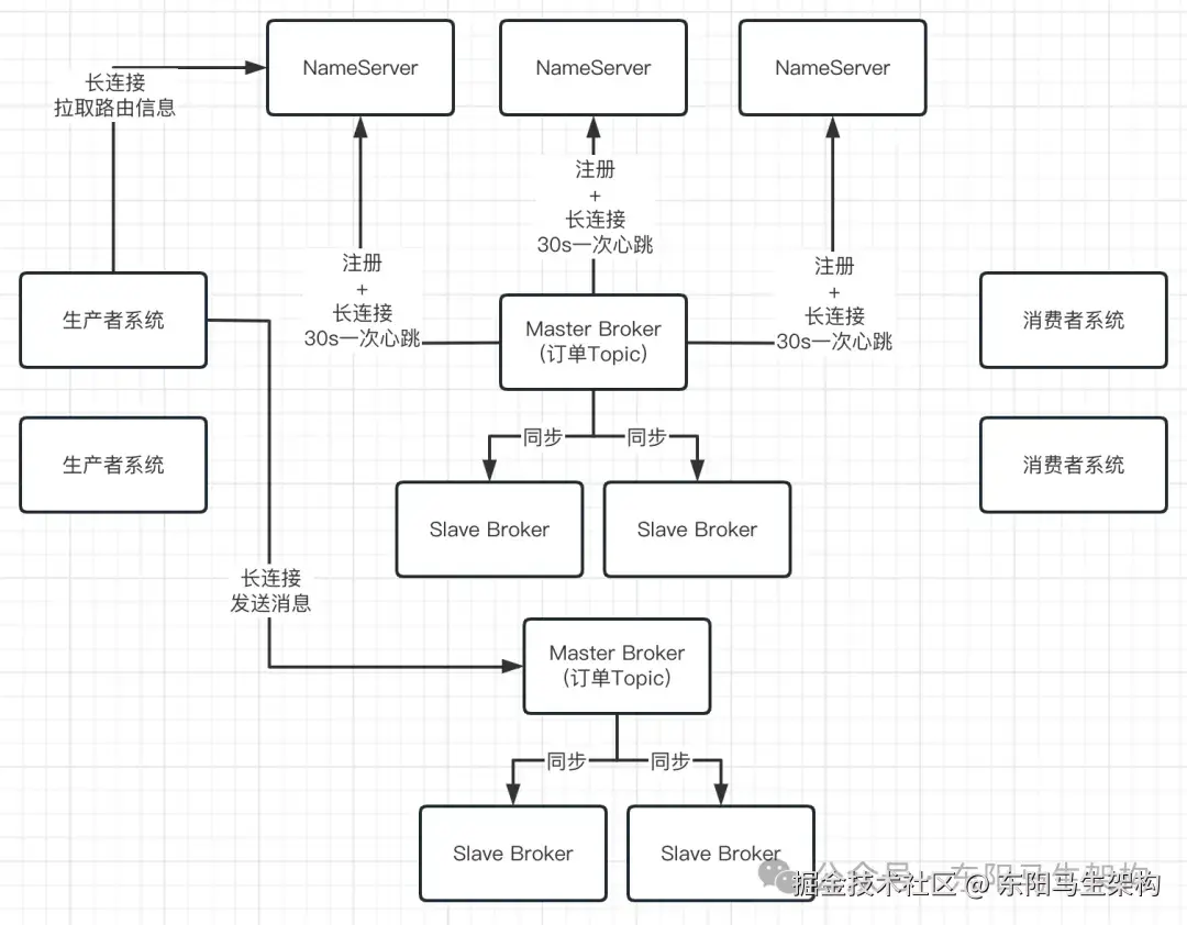 RocketMQ的解决思路是使用Broker主从架构以及多副本策略。简单来说,Broker有Master和Slave两种角色。Master Broker收到消息之后会同步给Slave Broker,这样Slave Broker上就能有一模一样的一份副本数据,这样同一条消息在RocketMQ整个集群里就有两个副本了:一个在Master Broker里,一个在Slave Broker里。这时候如果任何一个Master Broker出现故障,还有一个Slave Broker上有一份数据副本,可以保证数据不丢失,还能继续对外提供服务,保证了MQ的可靠性和高可用性。