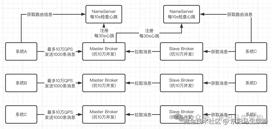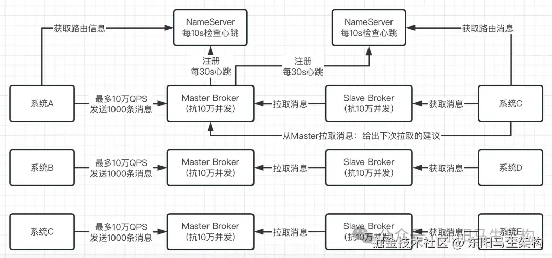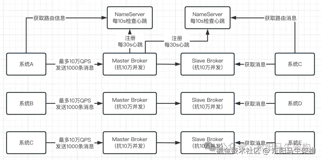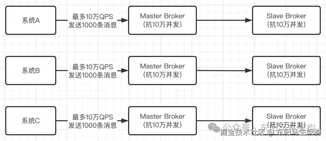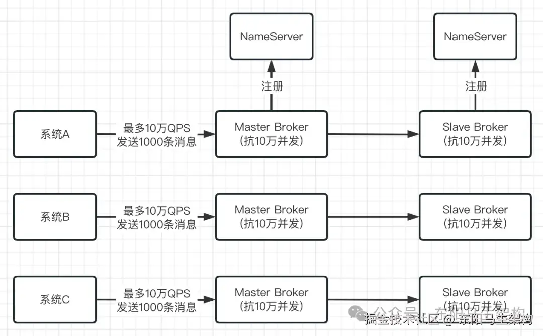 当RocketMQ部署在一台机器上,即使这台机器配置很高,但一般来说一台机器也就支撑10万+的并发访问。假设有大量的系统都要往RocketMQ里高并发的写入消息,可能有每秒几十万请求。此时由于RocketMQ是可以进行集群化部署的,通过部署RocketMQ在多台机器上,假设每台机器都能抗10万并发,然后只要让几十万请求分散到多台机器上、让每台机器承受的QPS不超过10万即可。如下图示: