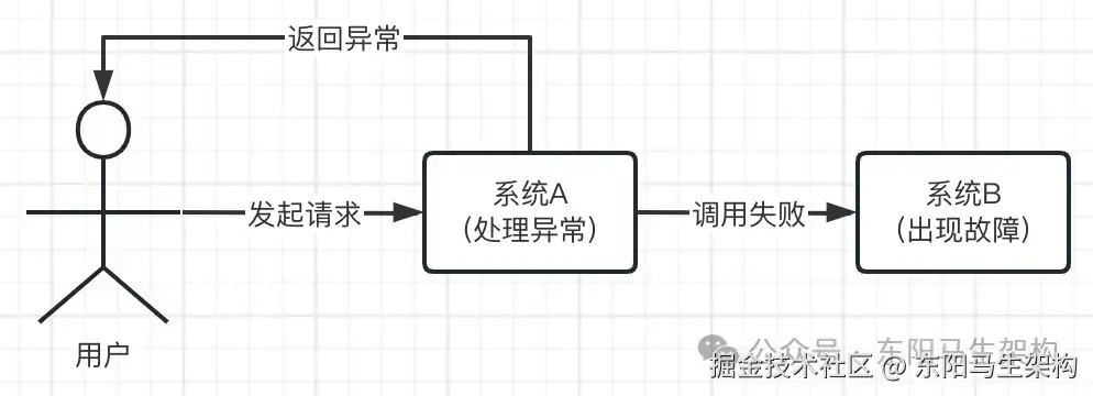 如果系统A同步调用系统B,这其实属于系统间的耦合,系统A和系统B互相之间会有影响。如果系统B突然出现故障,会导致系统A在调用系统B的时候感知到这个故障。由于系统B故障了,所以系统A对系统B的调用失败。系统A就得返回异常给用户,以及在后续处理这个异常。
