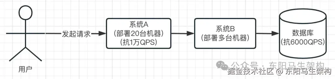 消息中间件还有一个特别好的功能叫流量削峰。假设系统A是不操作数据库的,因此只要多部署几台机器,就可以抗下每秒1万的请求。比如部署个20台机器,就可以轻松抗下每秒上万请求。然后系统B是要操作一台数据库服务器的,这台数据库服务器的上限是每秒接收6000请求。那么系统B无论部署多少台机器都没有用,因为它依赖的数据库最多只能每秒接收6000请求。