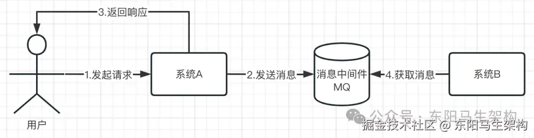 系统A一般会发送一条消息给MQ,接着系统A就认为自己的工作干完了,直接返回结果给用户。这时系统A跟系统B就没什么关系了,因为系统A要做的事情只是接收请求,发送消息到MQ,然后就返回结果给用户。然后系统B根据自己的情况,可能会在系统A投递消息到MQ之后的1秒内、1分钟之后,甚至1小时后,从MQ里获取到一条属于自己的消息,然后根据消息完成自己的工作。