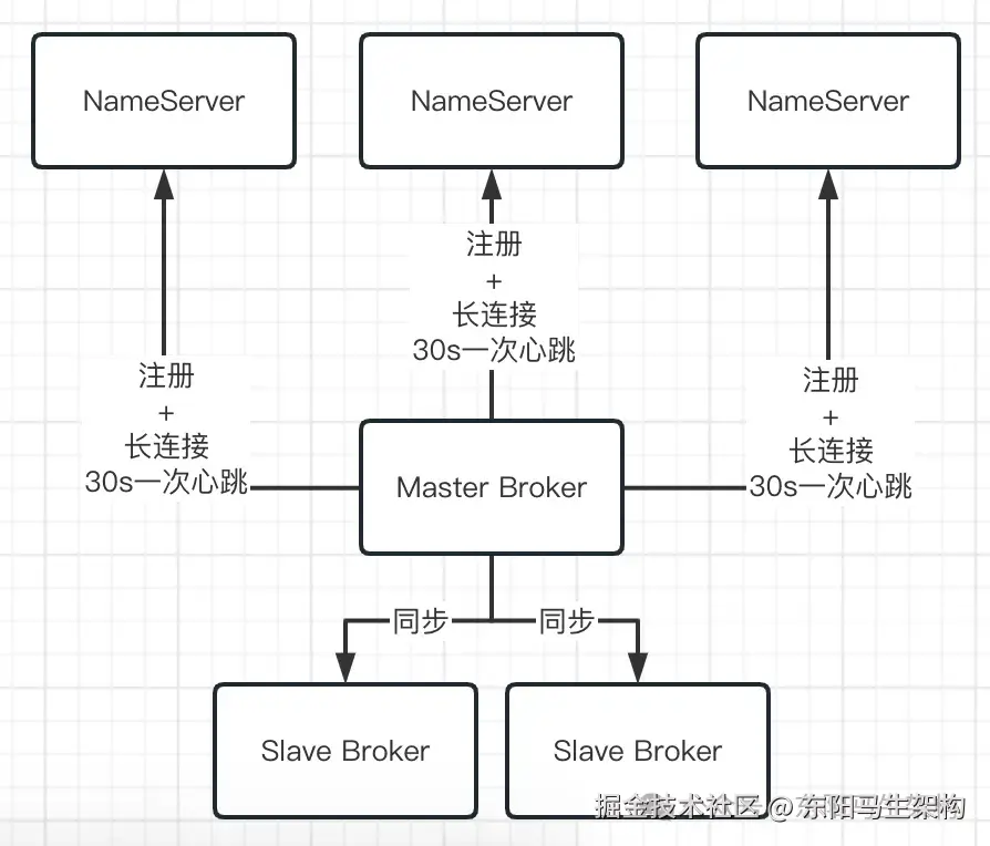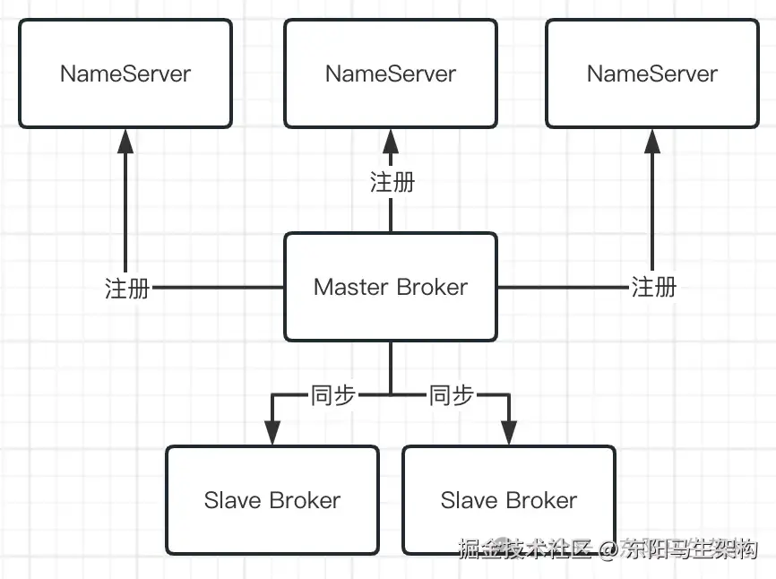 RocketMQ为了解决这个问题,引入了NameServer,它也是独立部署在几台机器上的。然后所有的Broker都会把自己注册到NameServer上去,通过NameServer可以知道集群里有哪些Broker。如下图所示: