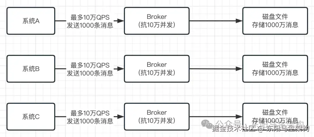 为什么呢?因为数据库复杂,它要能够支持执行复杂的SQL语句,支持事务等复杂的机制,支持对数据进行增删改查等。所以一般数据库单服务器也就支撑每秒几千的请求。但MQ就不一样了,它的核心功能就是让系统A发消息给它,再让系统B从它这里获取消息。这个就简单得多了,所以同等机器配置下,MQ一般都能抗几万并发请求。
