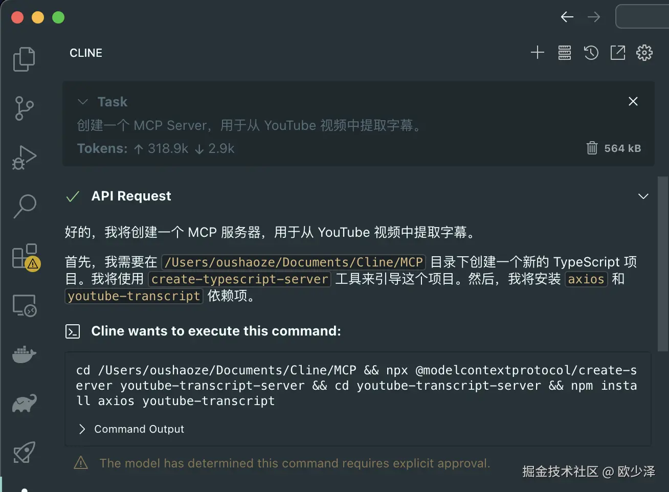 输入提示词“创建一个 MCP Server,用于从 YouTube 视频中提取字幕。”后,Gemini 会要求执行命令,这个命令用于创建 MCP Server 的源码。