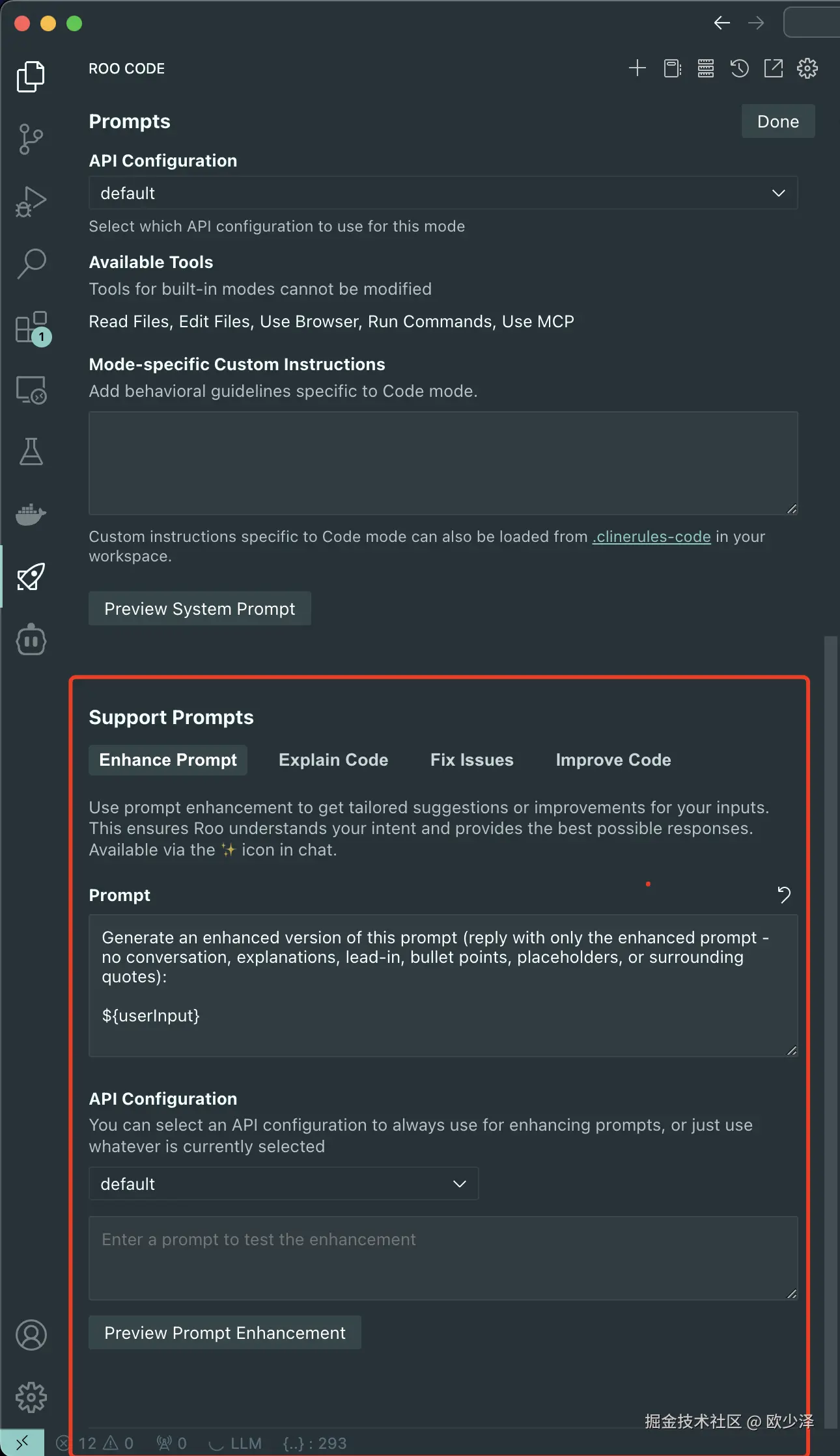 此外 Roo Code 还支持提示词增强,主要是为了帮助我们优化简单的输入,比如说我输入“优化代码”,Roo Code 会把这个提示词转变为“优化和改进代码以提高性能和可维护性”。