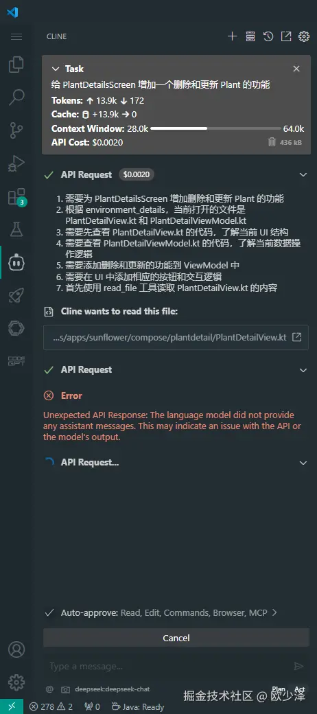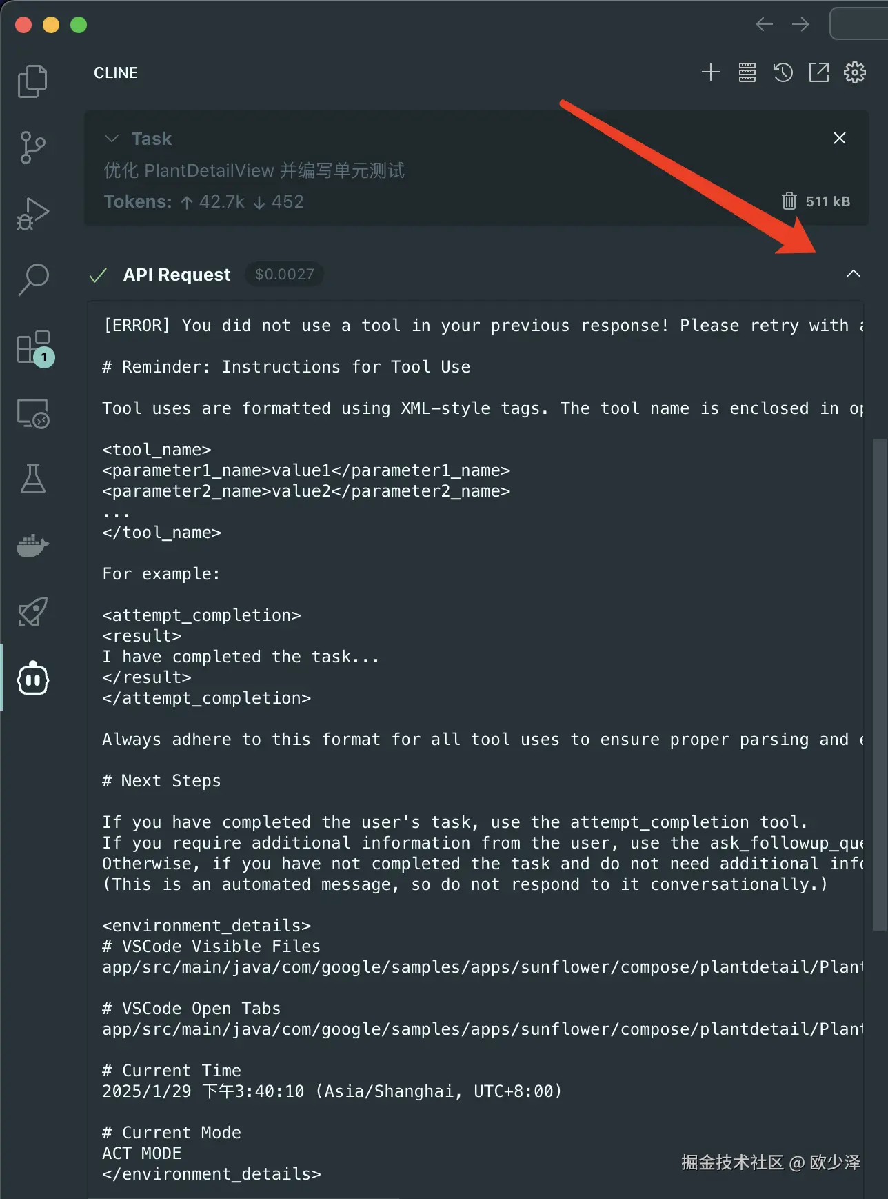 下面是执行任务的过程中,Cline 通过读取文件内容和环境信息,一起放到 API 请求中发送给模型的部分内容,点击 API Request 右边的按钮就可以展开查看具体的内容。