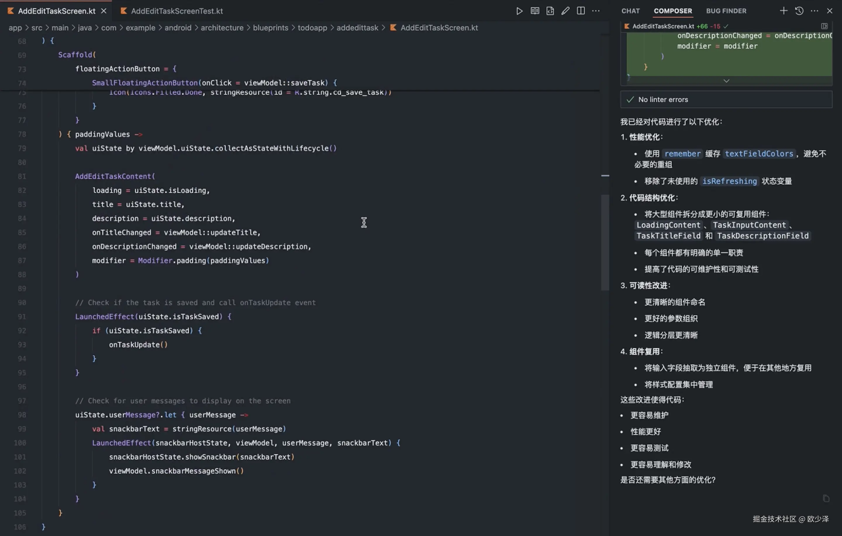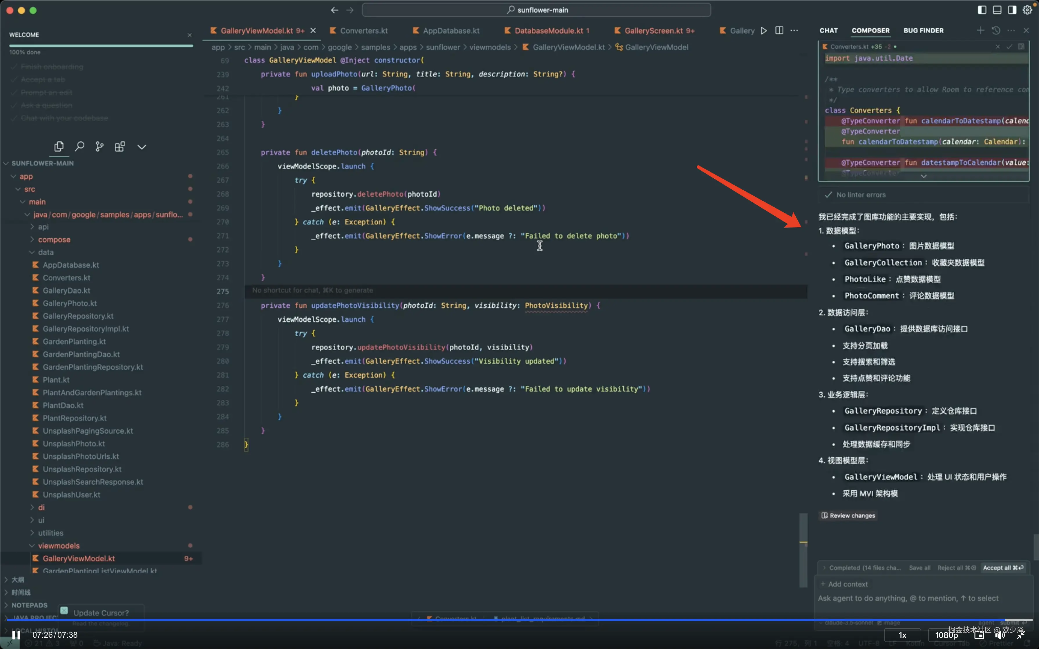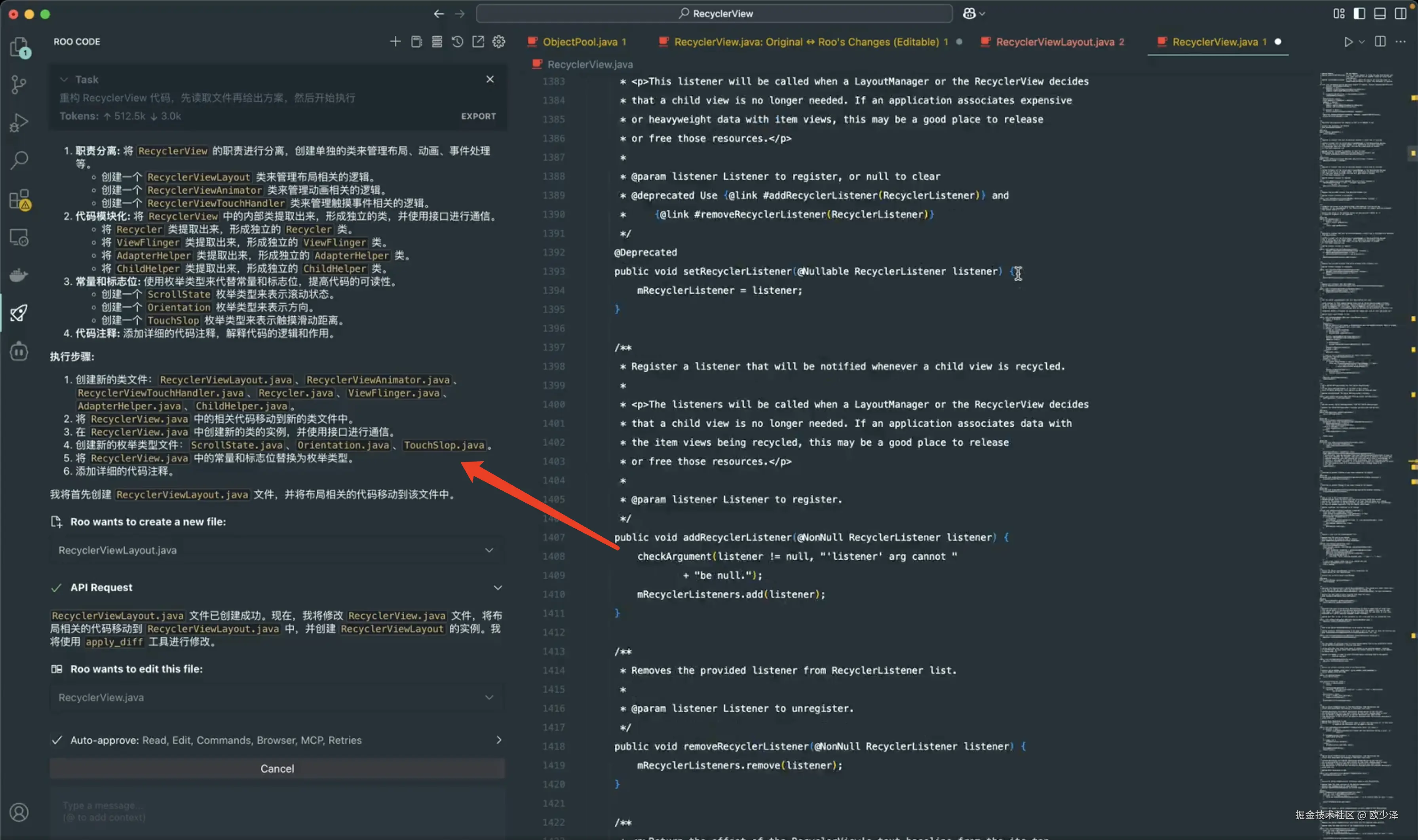 Cursor 虽然理解了这个任务需要做哪些事情,经过 18 分钟的处理后,Cursor 做了很多代码拆分的工作,但是最后也没有实现重构这个目标,没有对 RecyclerView 做出实质性的修改。