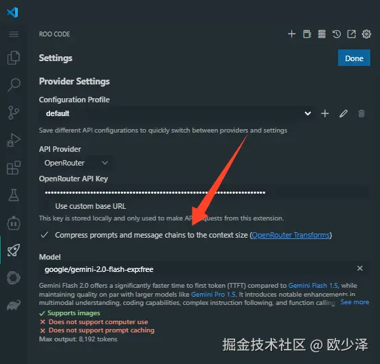 如果选择的 API 提供者是 OpenRouter ,那在 Roo Code 中还可以自定义 API 的 baseUrl 。为了让自定义的 baseUrl 可以访问 GLM 等模型,我做了一个简单的示例仓库 OpenRouterRedirect 。 此外选择 OpenRouter 作为 API Provider 的时候, Roo Code 还支持启用提示词压缩,这个设置项可以减少 token 的消耗。