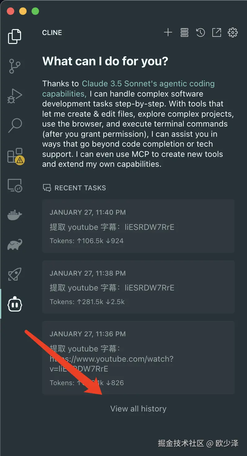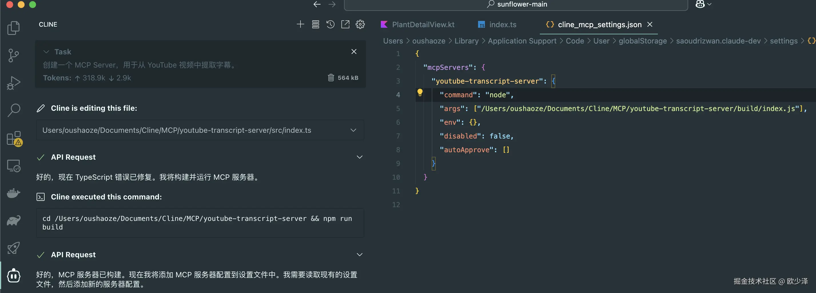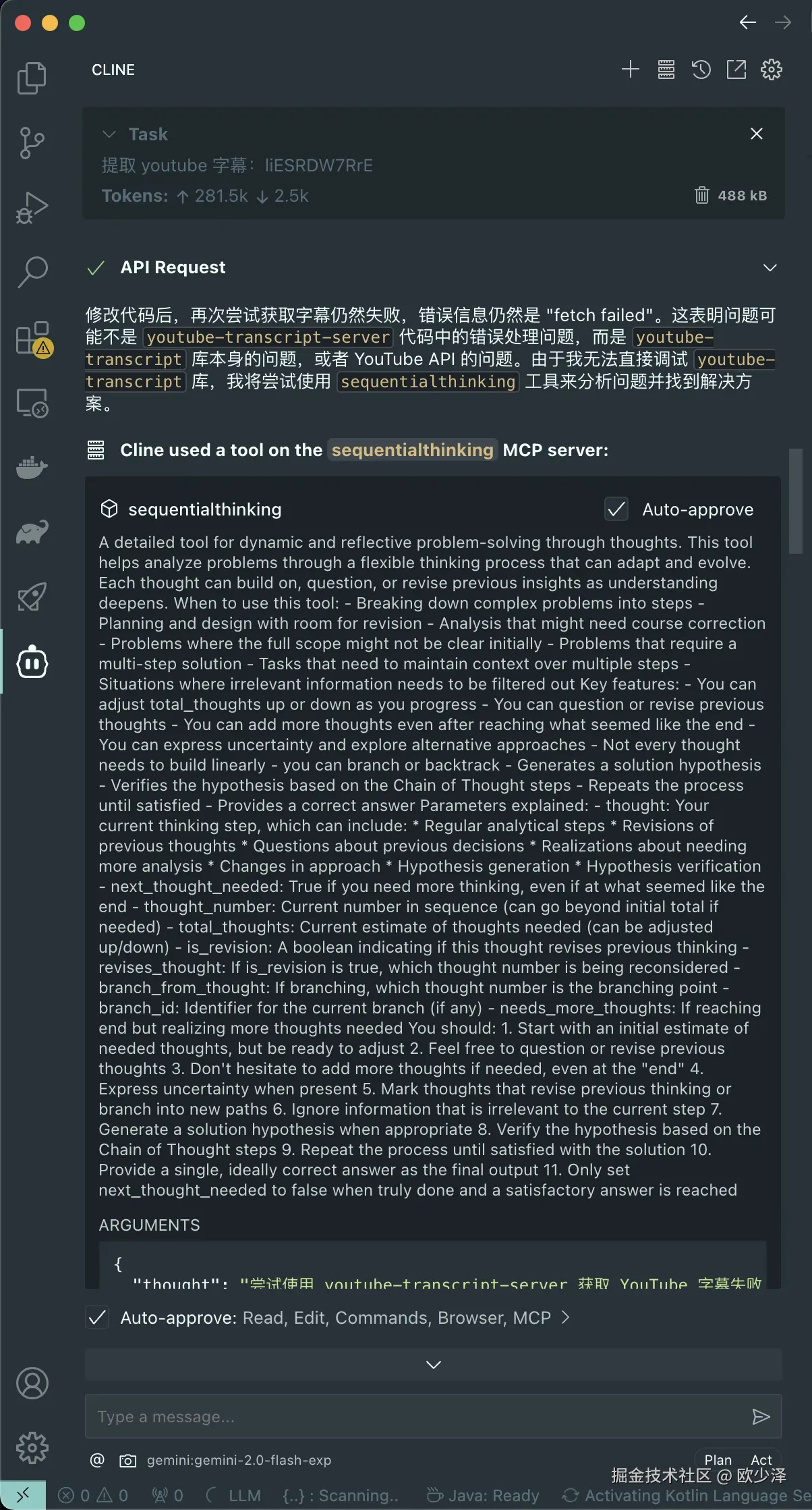 通过 Cursor 调整源码后,再用 Cline 获取字幕,效果如下。在遇到错误的时候会尝试调用 SequentialThinking 找出解决方案。