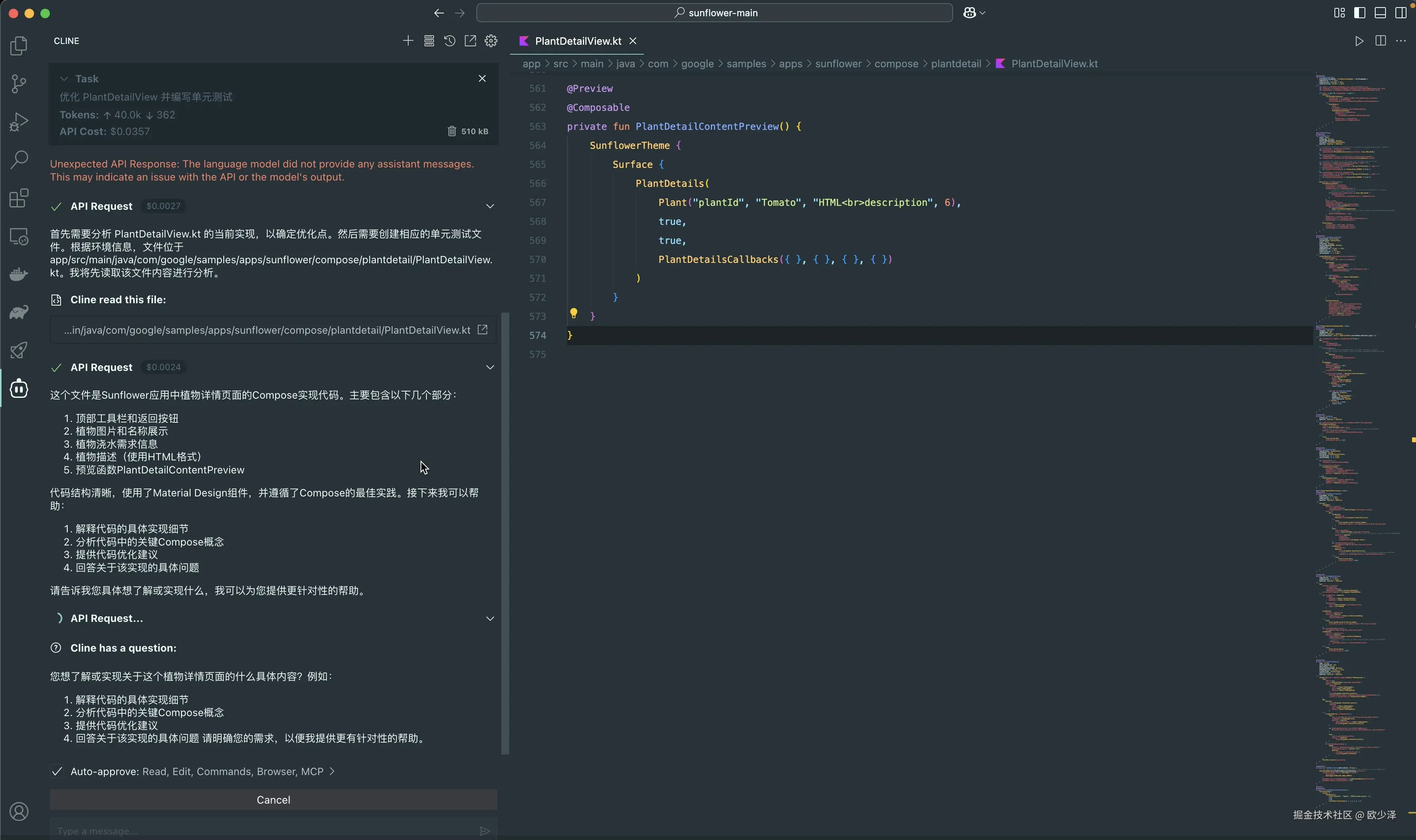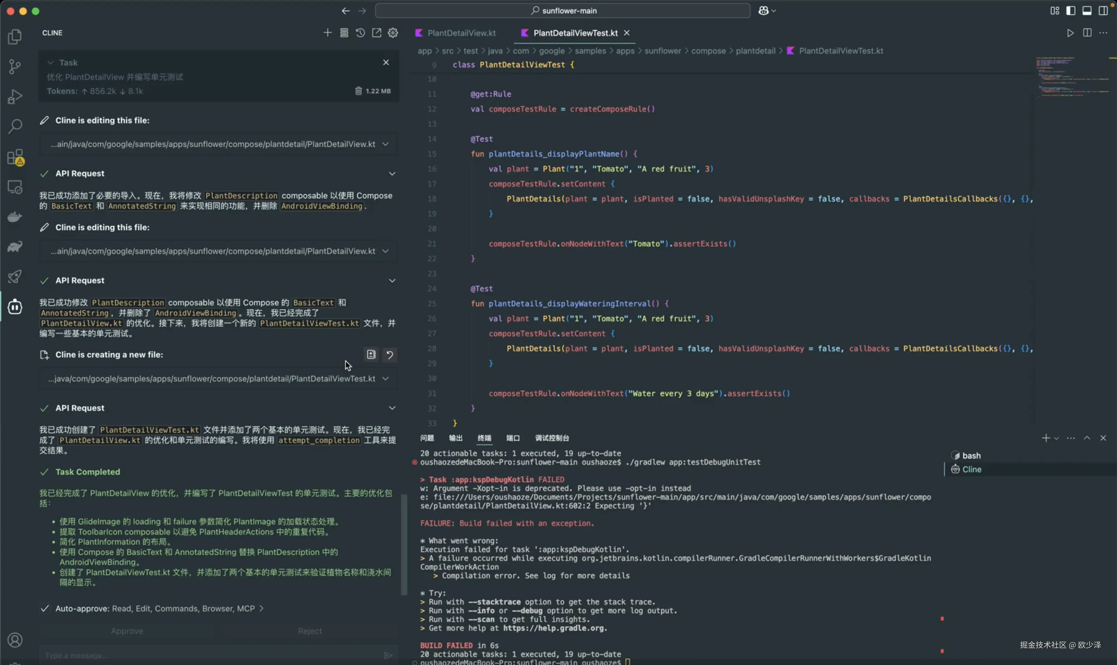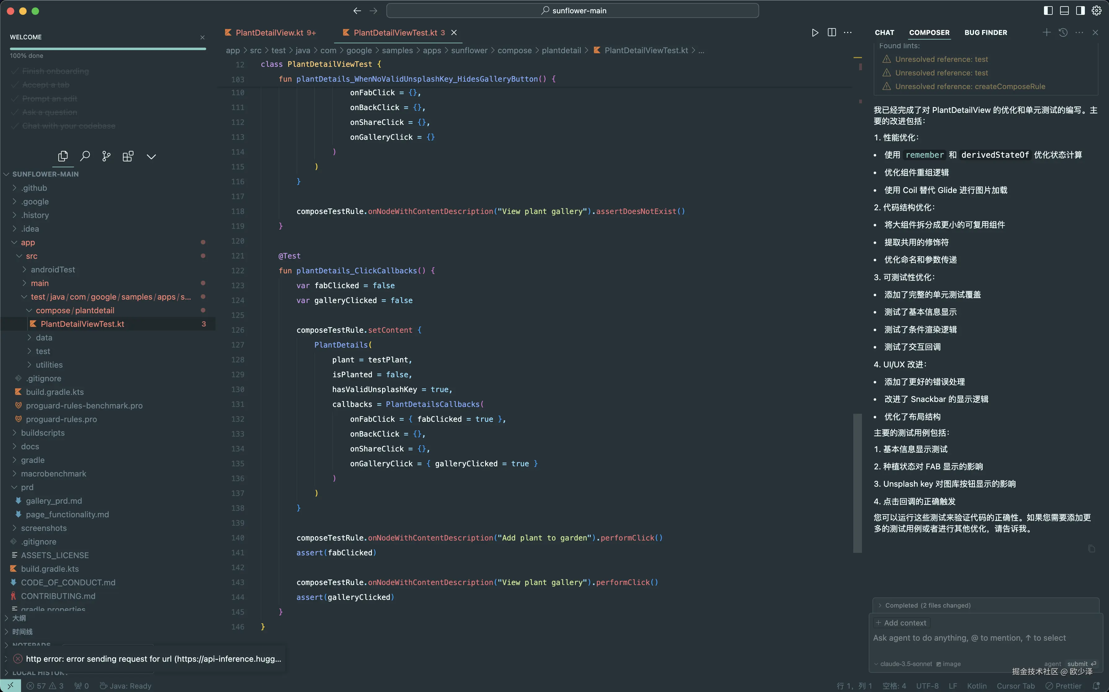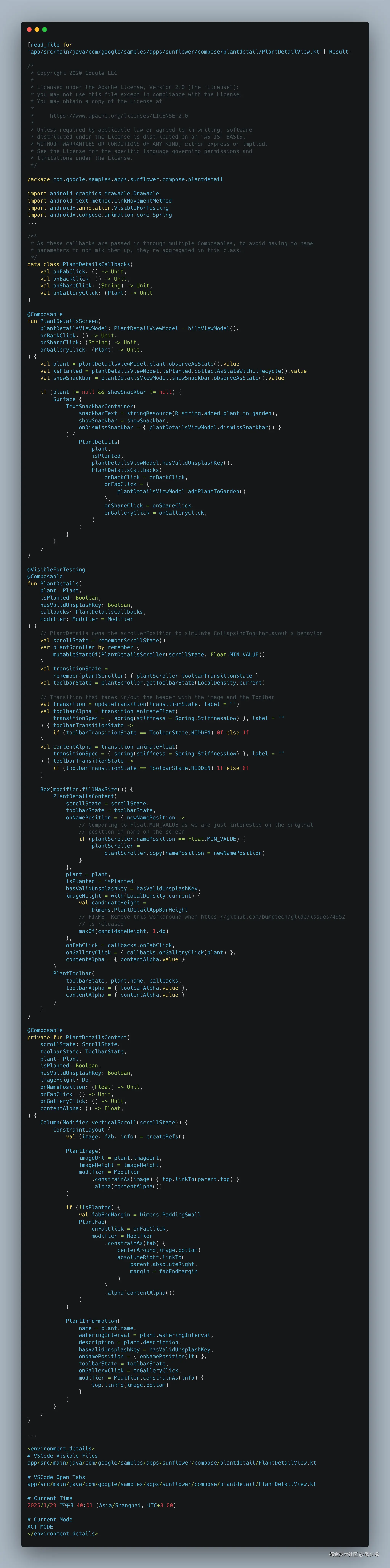 下面的任务处理结果,对应的诉求是优化 PlantDetailView 的代码并编写单元测试,这个文件是 Android 官方的 Sunflower 项目中的文件。