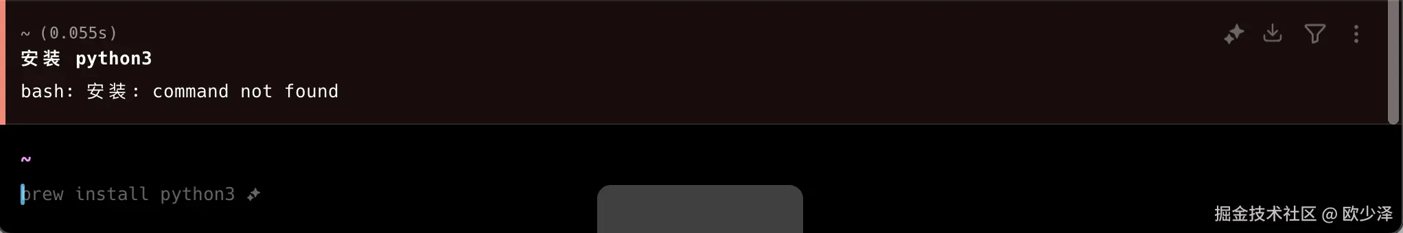 比如我输入“安装 python3”,失败后则会提示我改用命令“brew install python3”,这时我按下 Tab 键,就能看到命令已经输入好了。