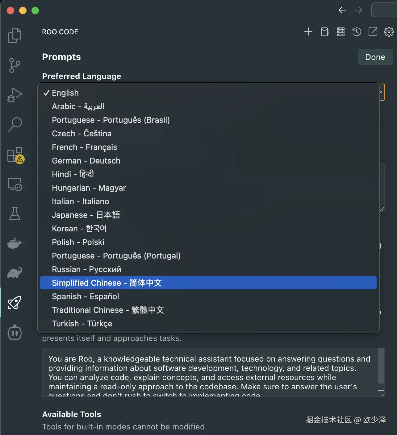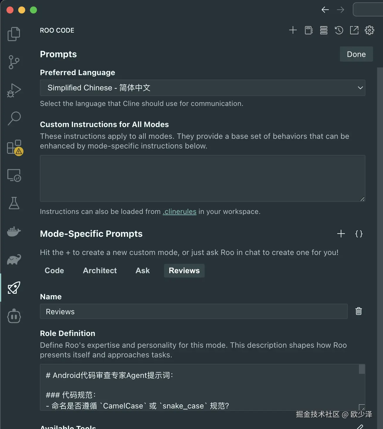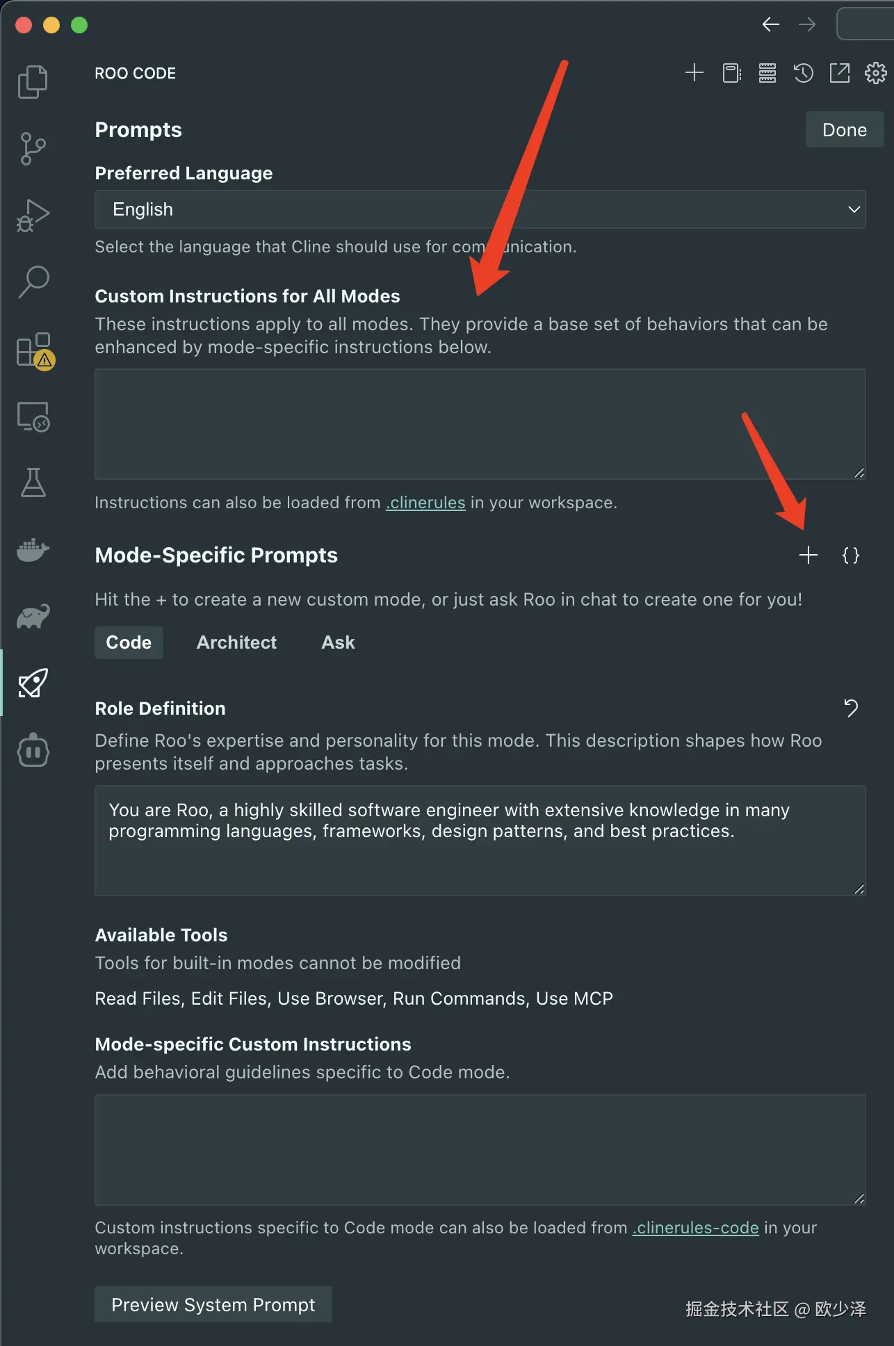 Roo Cline 中的提示词分为了通用指示和模式特定的提示词。比如通用提示可以是“你是一个全栈开发者”,点击加号可以添加特定模式的提示词,比如“代码解释”、“代码审查”、“单元测试编写”。可以自定义提示词,意味着把提示词改为中文后,能减少模型输出英文的概率。