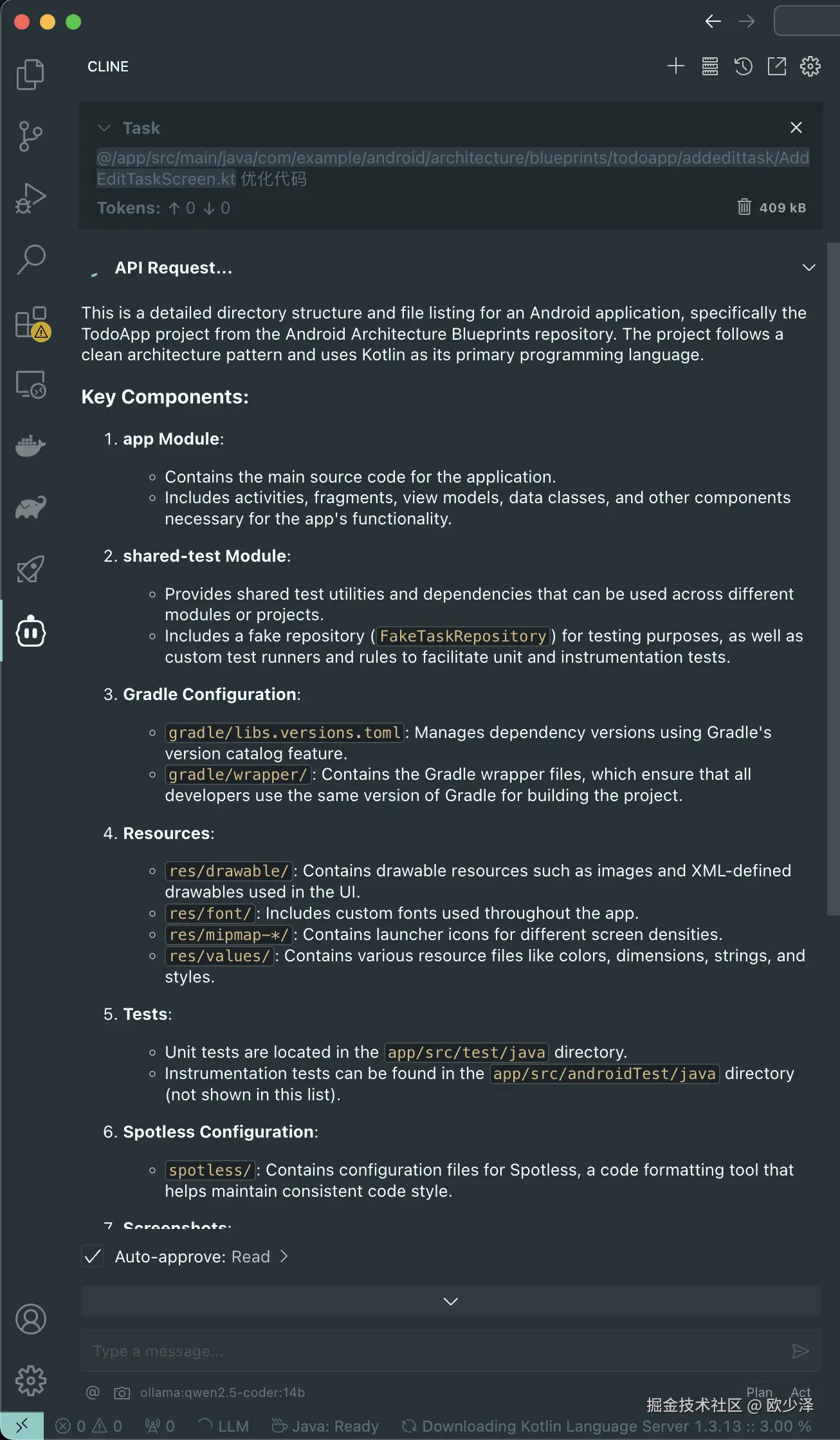 从下面的内容中可以看到 Cline 会把打开的标签、模式(act/plan)、文件内容等信息都传给模型,这意味着如果你只是说“优化代码”的话,对于不够智能的模型(比如7b 的模型)来说,可能会先解释项目目录中有哪些内容,再来处理任务。