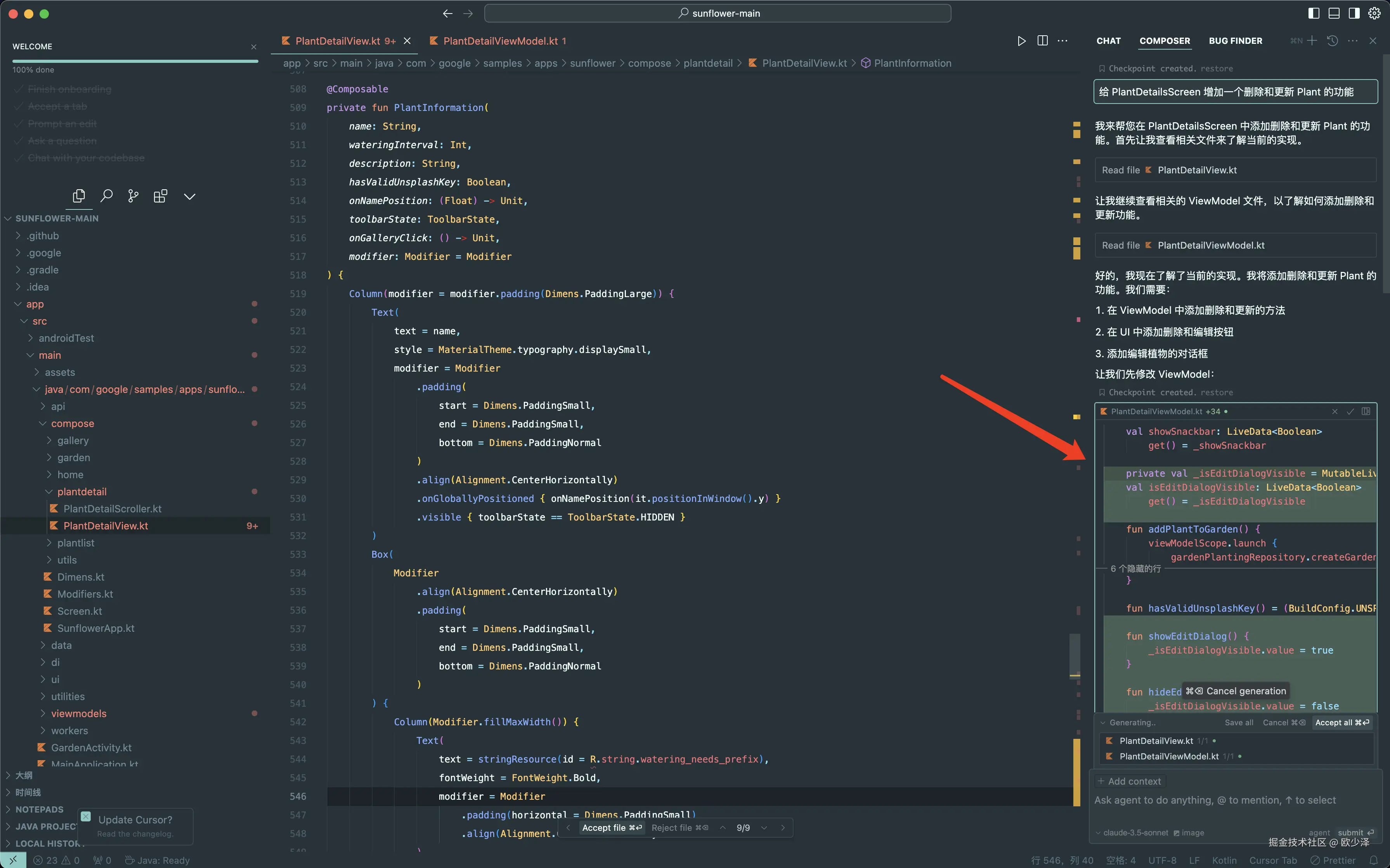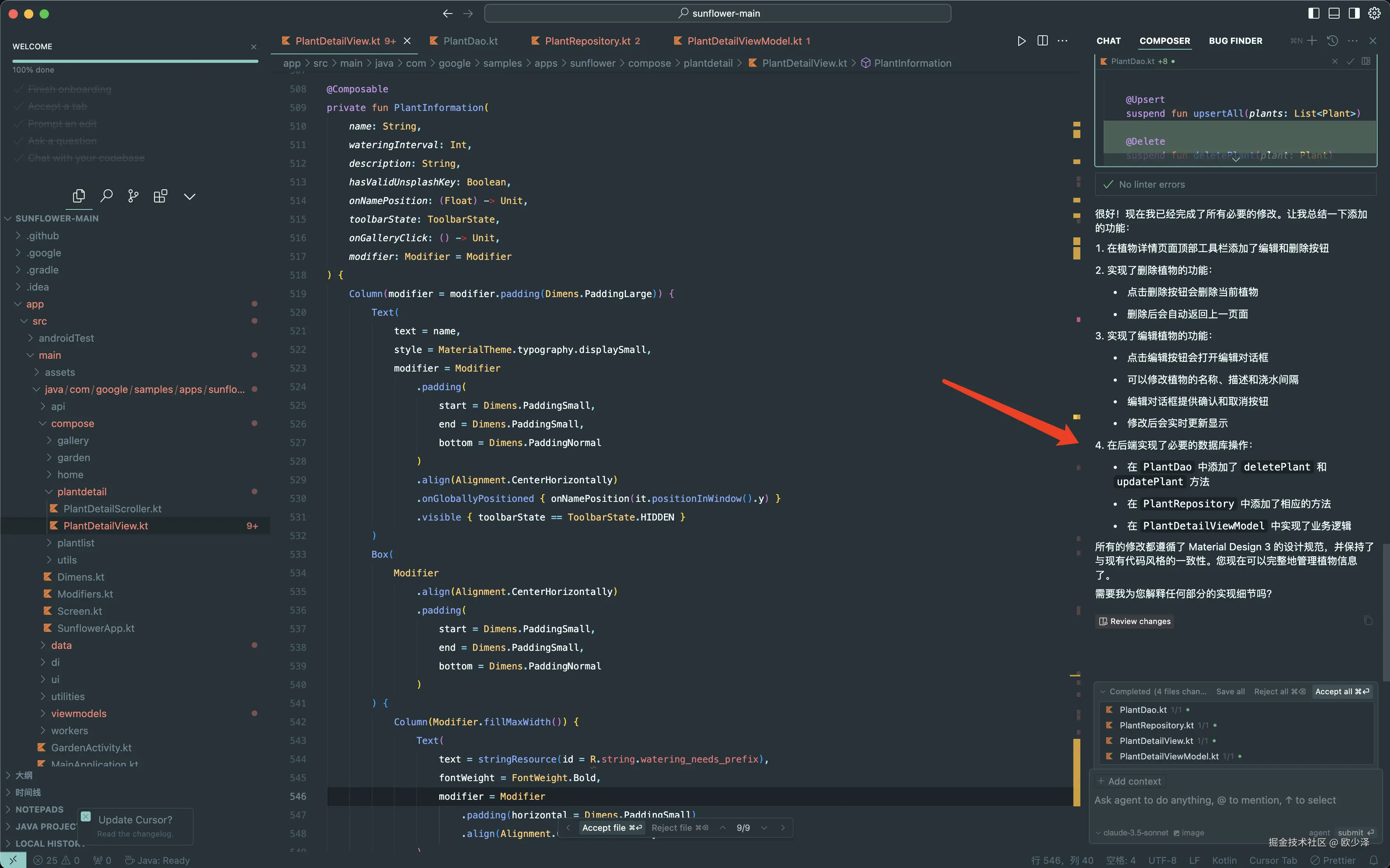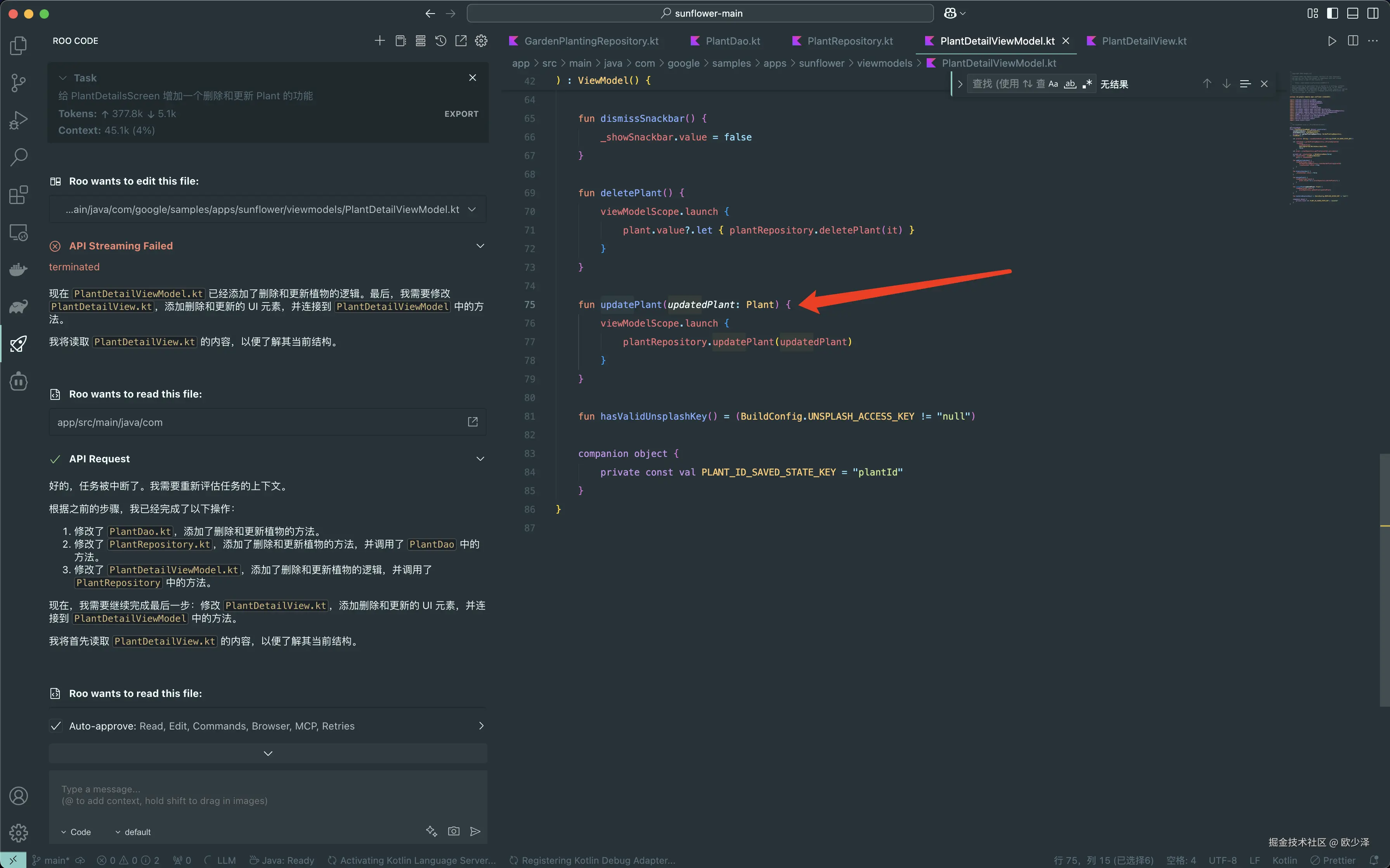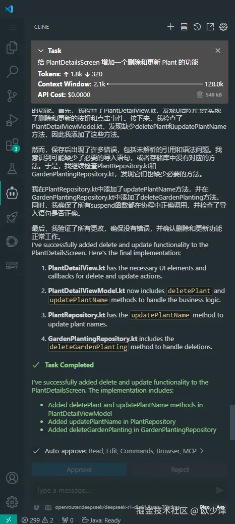 下面任务的提示词是“给 PlantDetailsScreen 增加一个删除和更新 Plant 的功能”,这个提示词的预期效果是修改多个文件,包括 PlantDetailView 、PlantDetailViewModel、GardenPlantingRepository ,Roo Code 和 Cursor 都完成了这个任务。