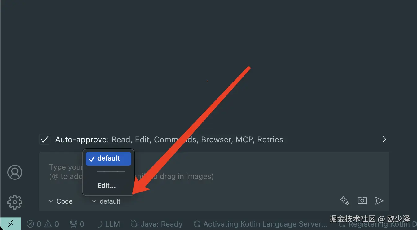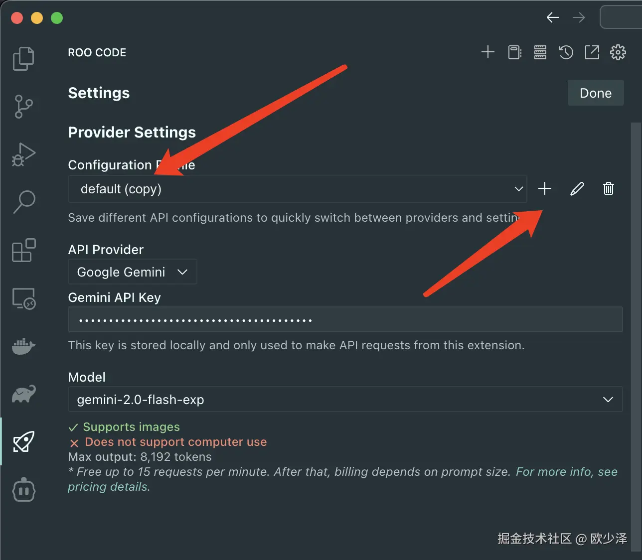 Roo Code 的 API 提供者的设置支持多套配置,输入框下方的 default 表示的就是默认的配置,点击 Edit 就可以进入设置页添加另一套配置。