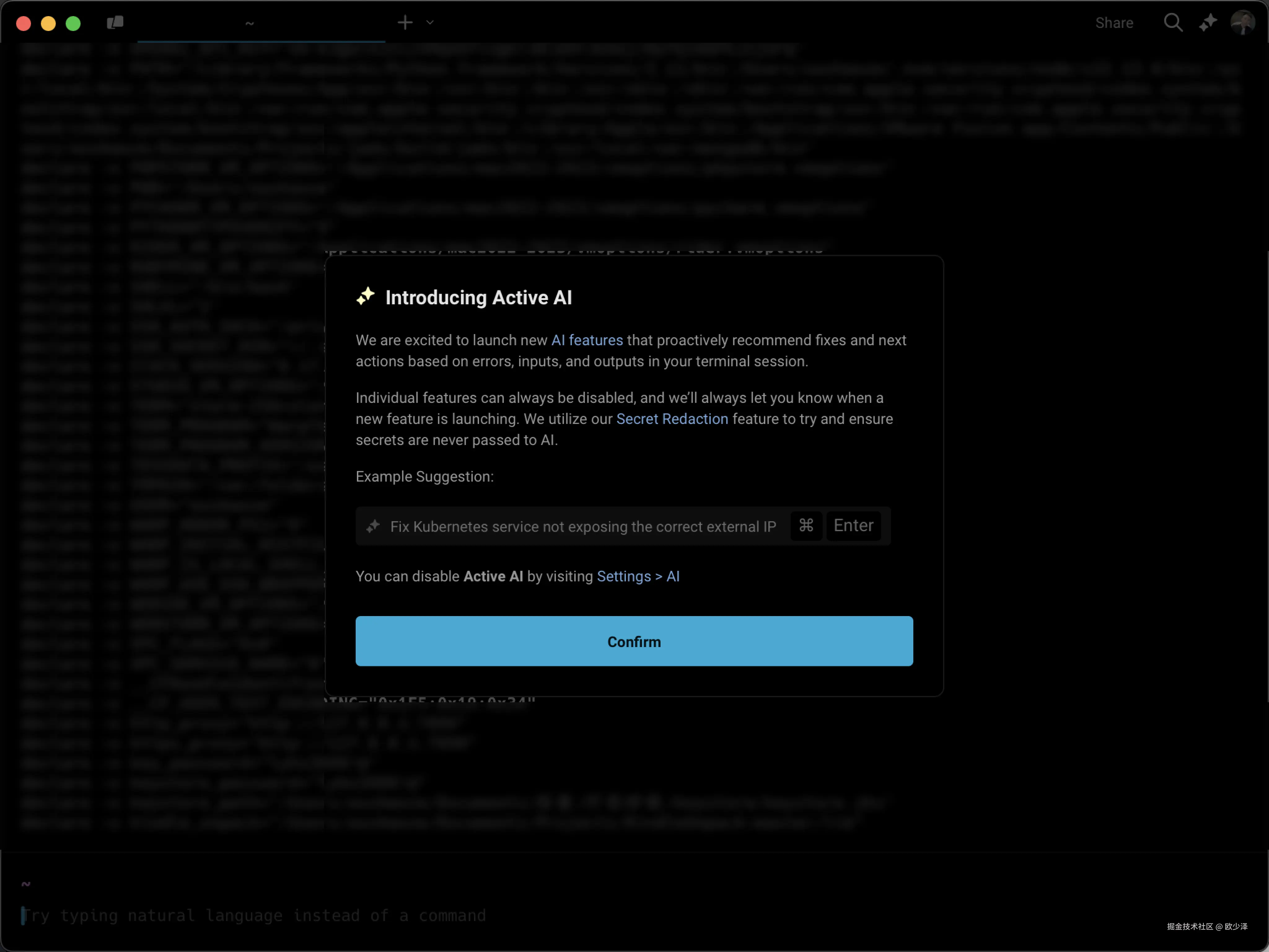 下载 Warp 后可以看到一个弹窗,点击确认后则开始启用 AI 功能,终端里还会提示你可以输入自然语言而不是命令。
