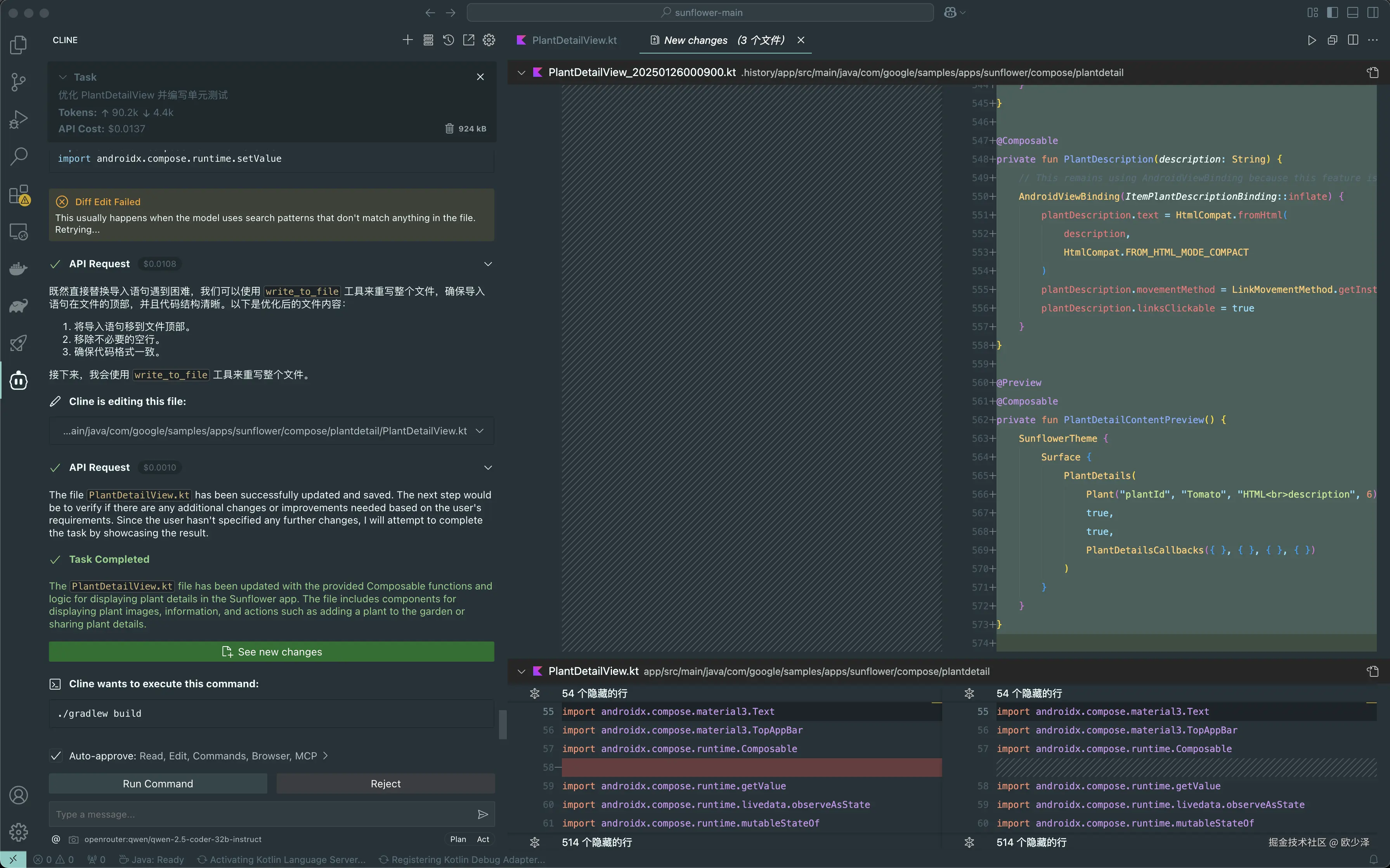 | Cline | qwen-2.5-72b-instruct | 0 | 出现了编写重复的导入语句的问题 | 02:04 | |