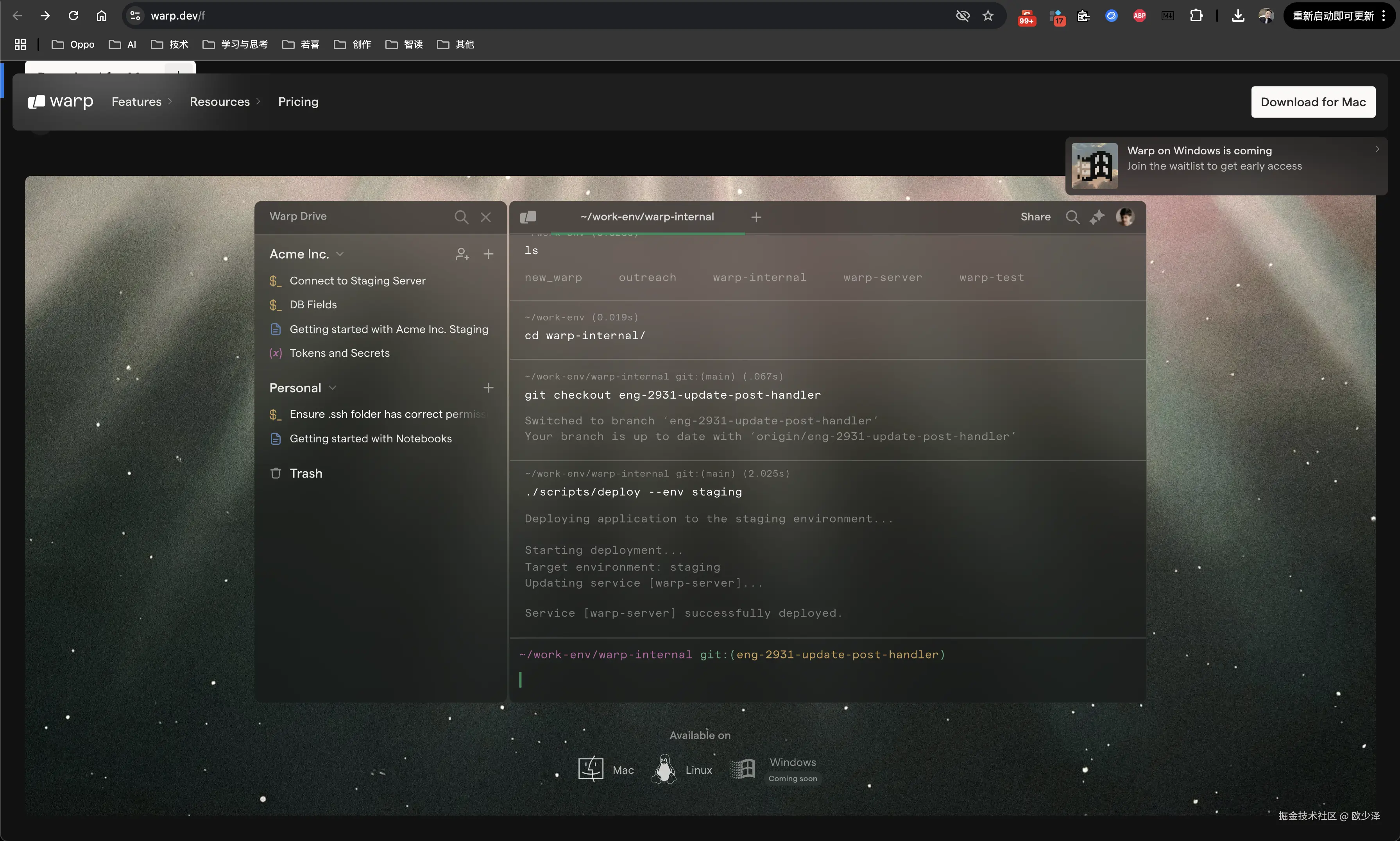 - AI 工作流辅助:自动生成命令建议、命名并描述工作流(Warp Drive)。