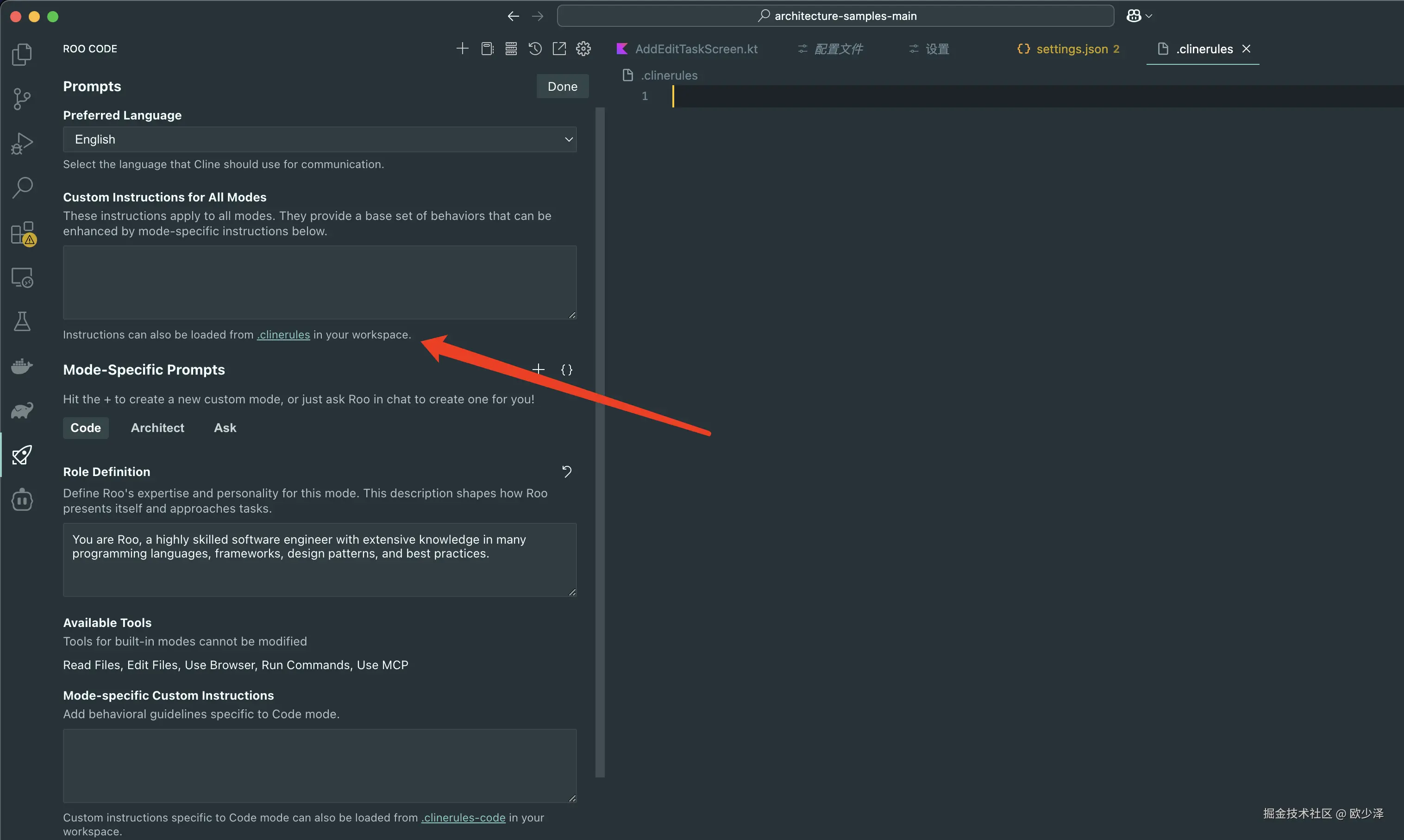 在设置中点击 .clinerules 就会看到 Roo Cline 创建了 .clinerules ,这个文件的配置和 .cursorrules 类似,都用于设置项目级别的提示词。