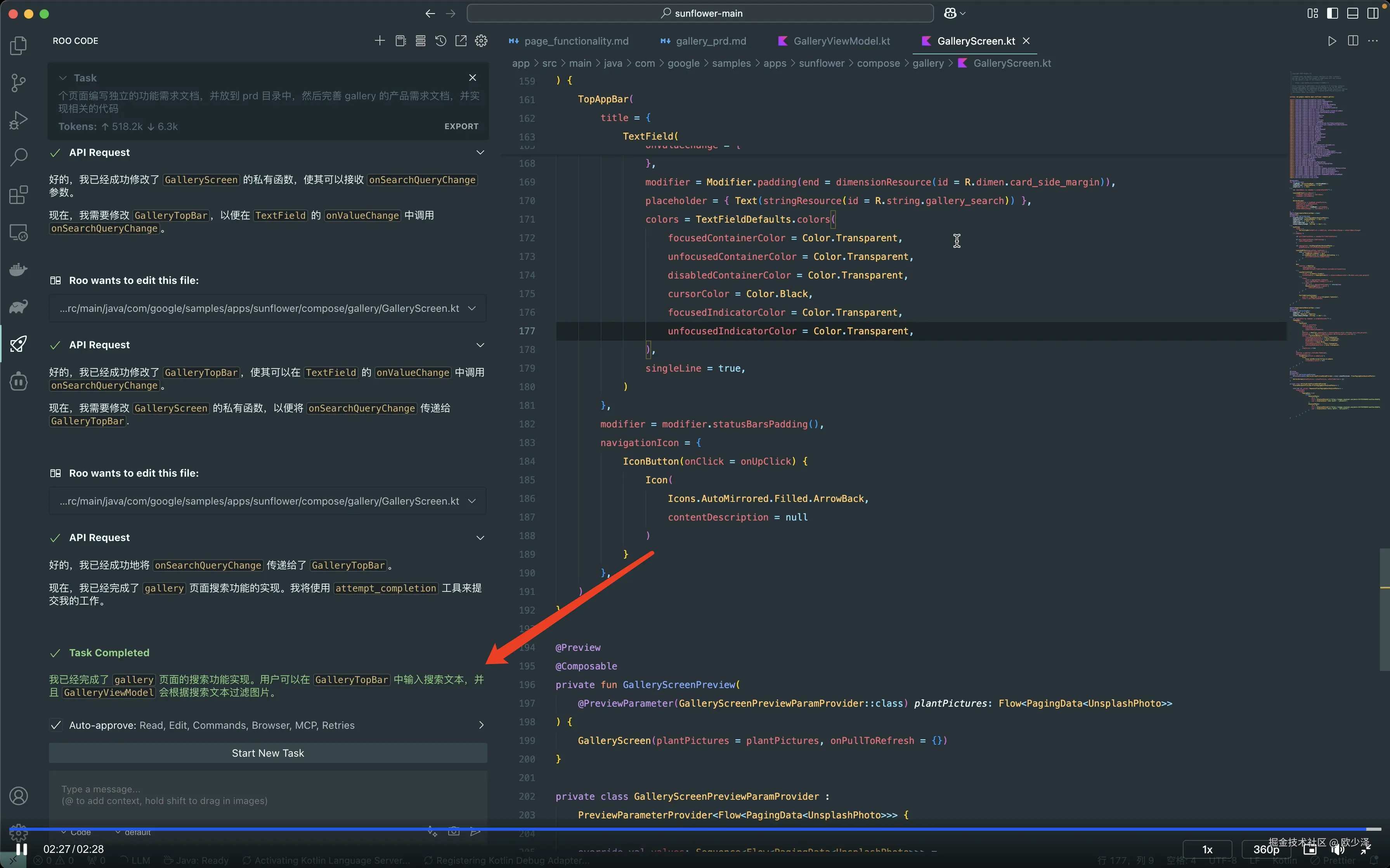 由于 Cline 处理这个任务失败了,下面是 Roo Code + Gemini 处理相同的任务的完成情况,花了 15 分钟,也没有给出一个明确的重构方案和结果。