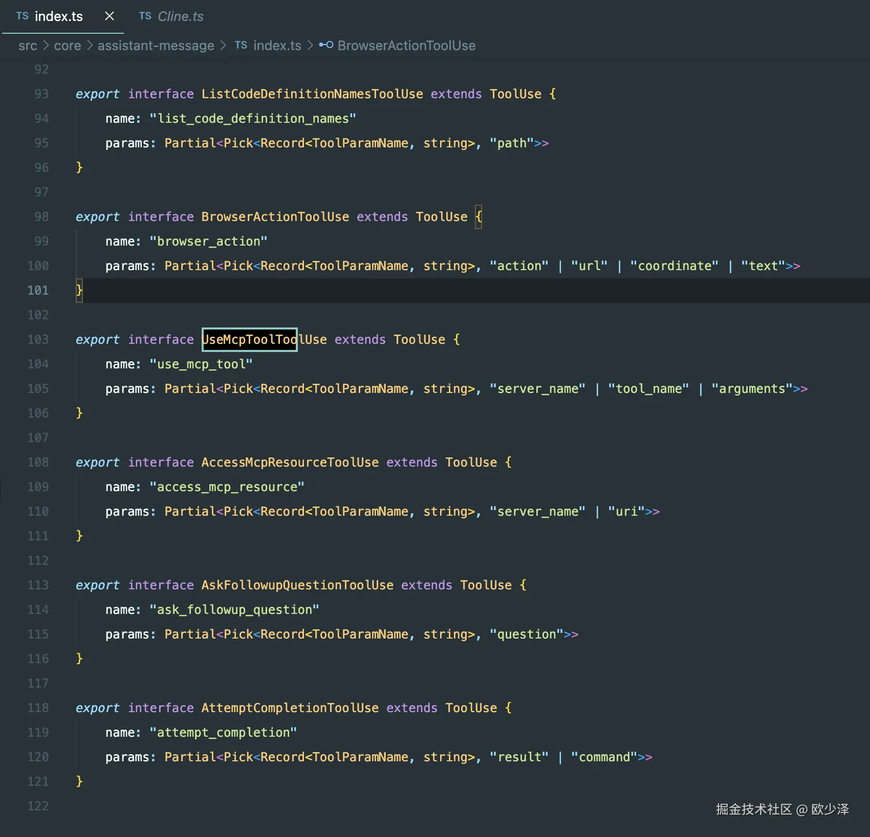 在 Cline 的代码中,定义了下面这些工具,其中就包括 use_mcp_tool。