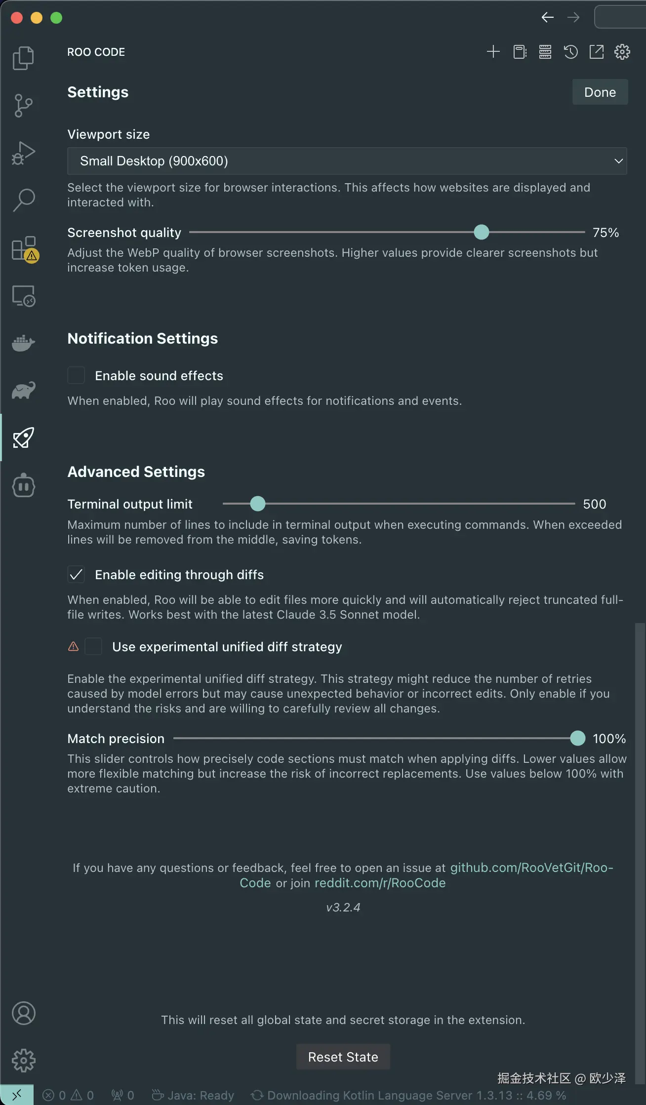 Roo Code 还支持浏览器视窗大小、通知音效、终端输出的行数限制等设置。