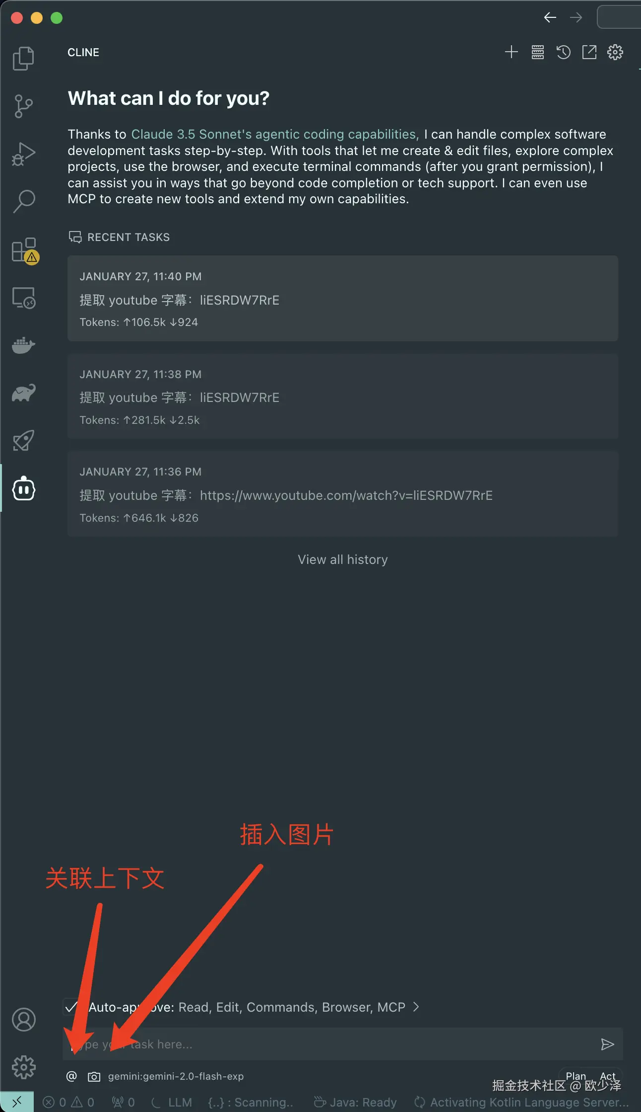 当我输入“提取 youtube 字幕:www.youtube.com/watch?v=liE… Gemini 就会调用 youtube-transcript-server 工具,