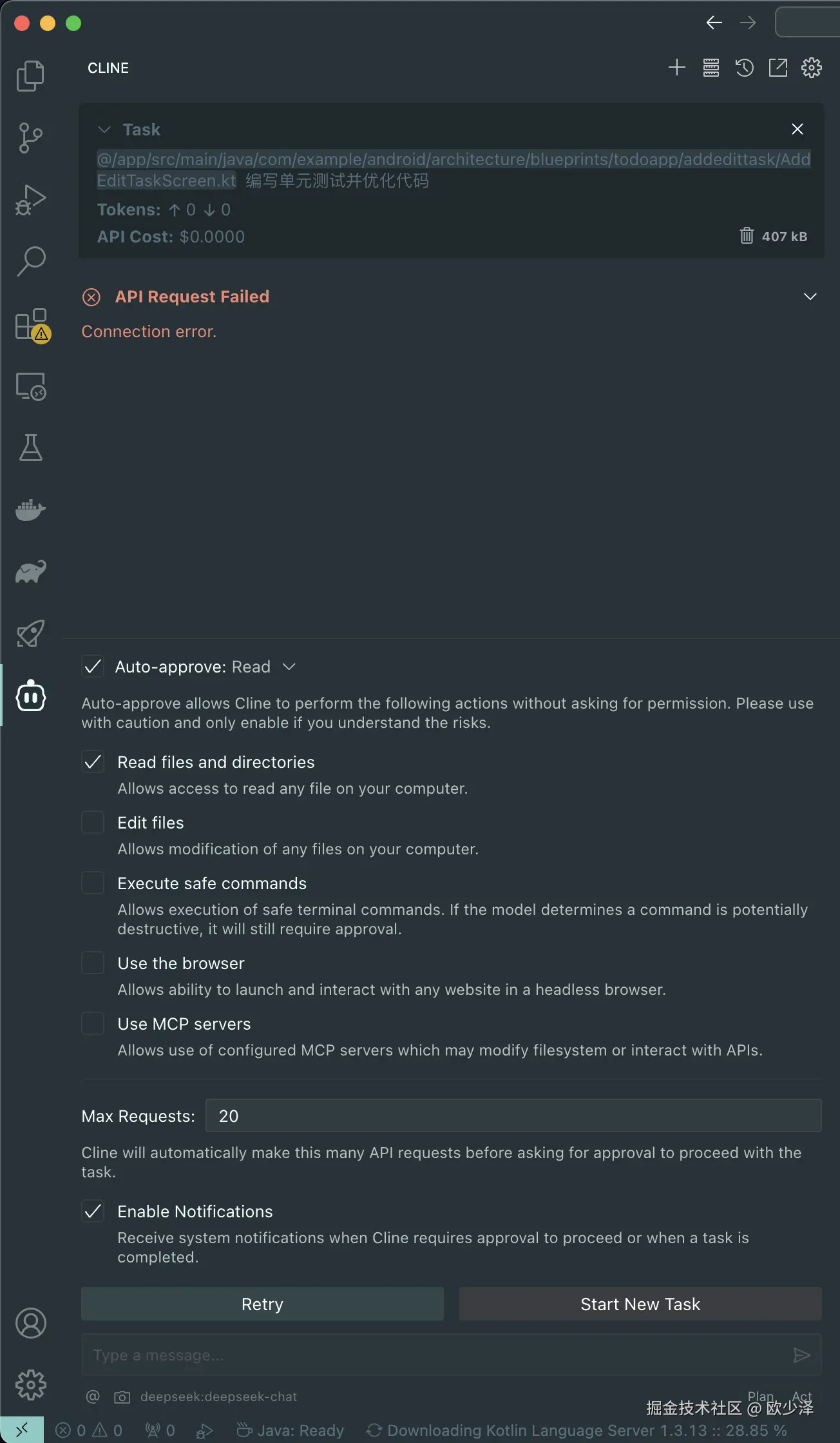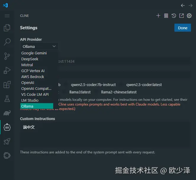 在本地大语言模型工具的支持方面,Roo Code 只支持 LM Studio,不支持 Ollama ,而 Cline 是支持的。LM Studio 不支持使用 Intel 芯片的 MacOS 客户端。