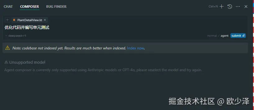 | Cursor | DeepSeek-R1 | Agent 模式不支持 DeepSeek-R1 | NA |
