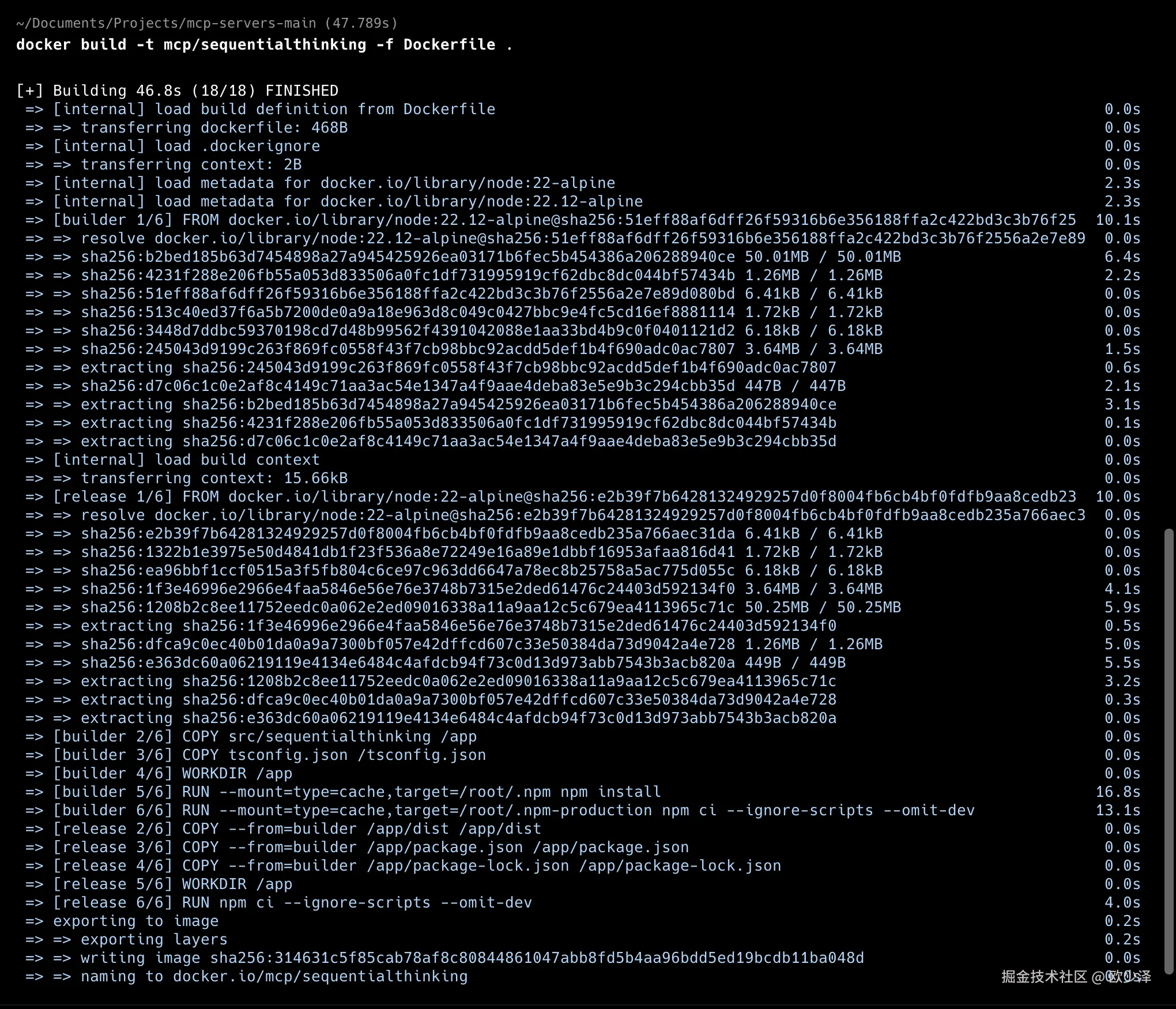 克隆或下载 Servers 开源库后,进入 servers 目录,执行下面的命令。记住:不要进入 sequentialthinkging 目录执行下面的命令,因为下面的命令指向的就已经是 sequentialthinking 目录中的 Dockerfile。
