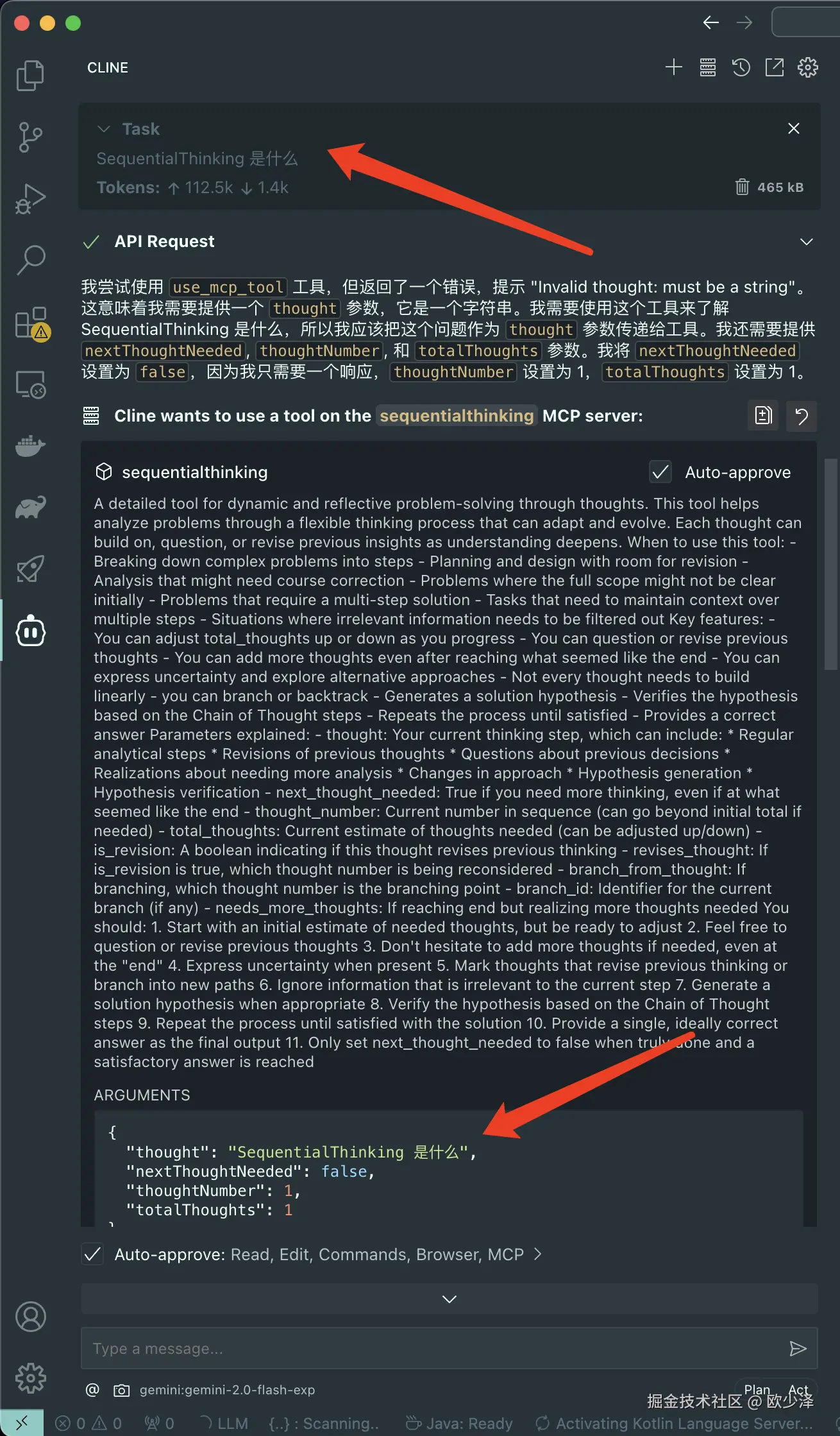 当我的提示词是“SequenialThinking 是什么”的时候,Gemini 就会开始尝试用 use_mcp_tool 工具来调用 MCP 服务。