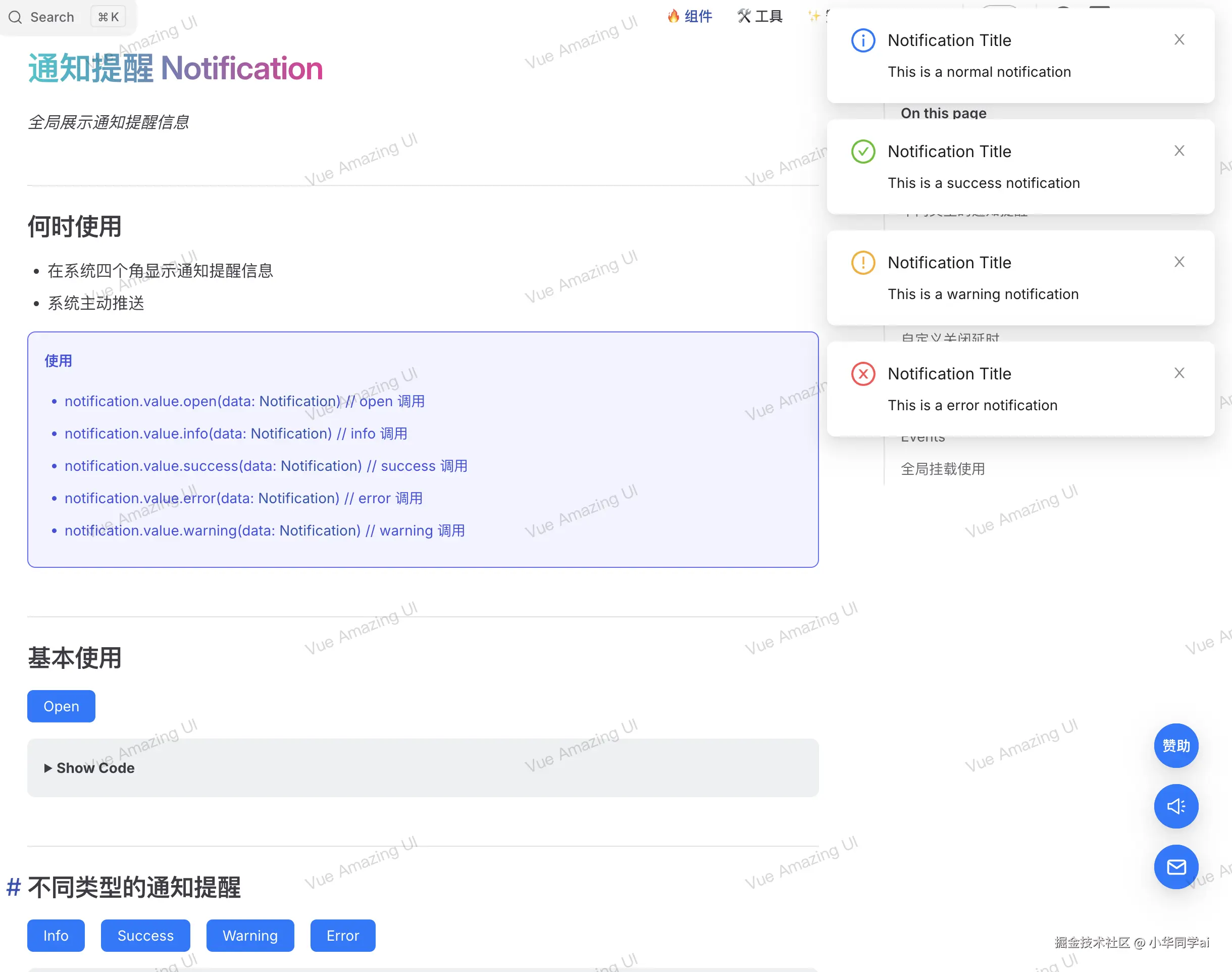 • 在有新消息、提醒或者警告等情况时,Notification 组件可以以通知的形式显示在页面的某个角落或者在系统通知栏中。