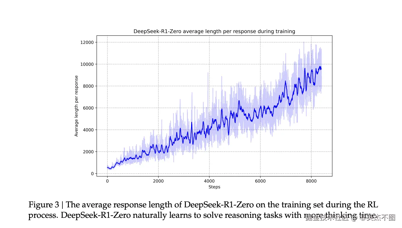 并且观察到了明显的“进化”现象,随着训练步数的增加,输出平均长度也在增加。意味着LLM似乎自己已经潜移默化学会了进行更多的思考和推理,达到更好的效果。