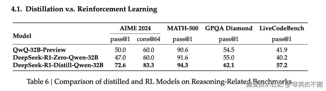 从实验结果来看,蒸馏又便宜又实用。用小的模型进行SFT+RL操作,最后的效果远不如直接蒸馏更好。